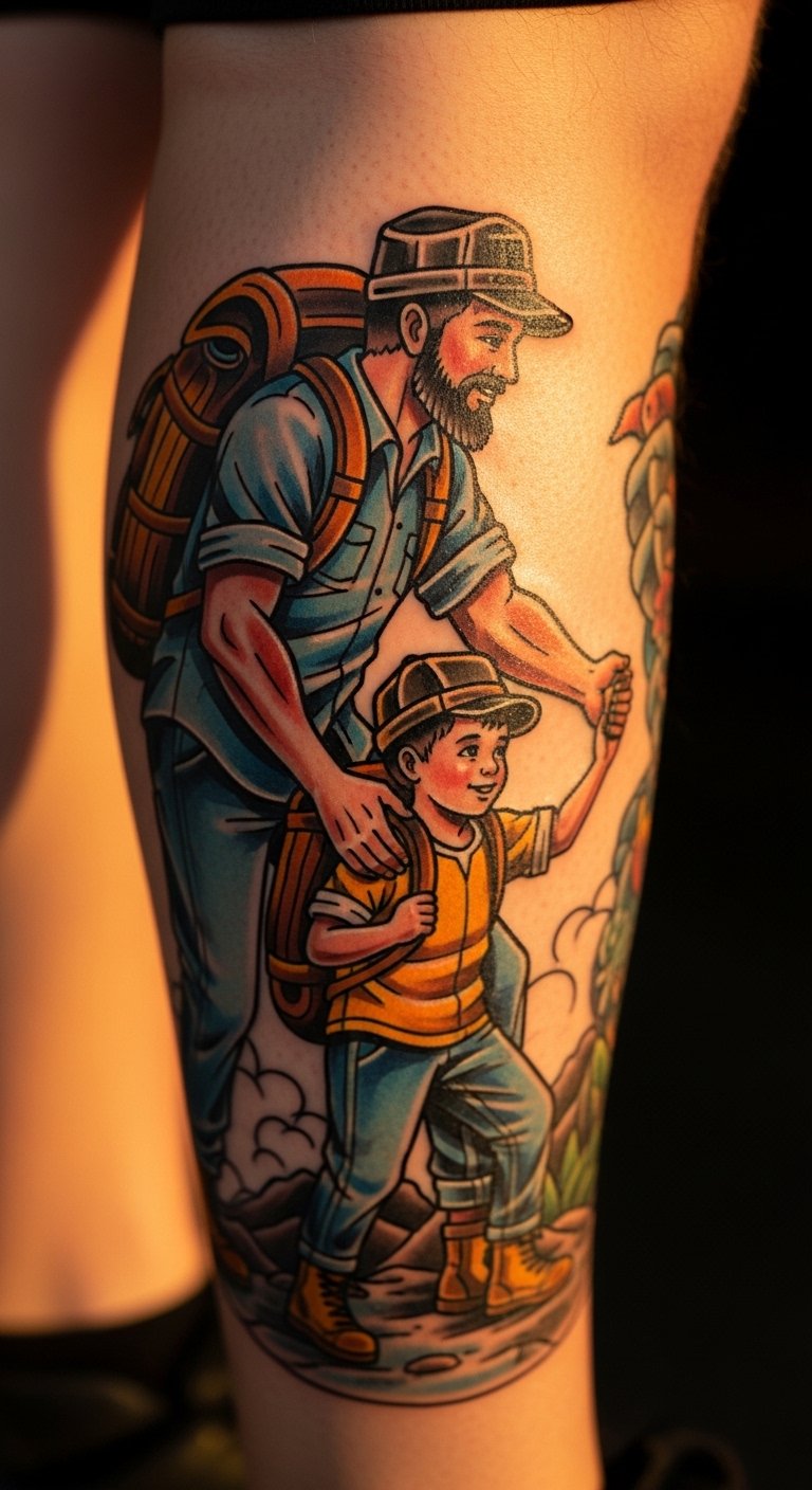 Neo-traditional styles bring fun colors to the mix. Picture bold lines and shades of a father-son hike. Draw a rough version at home using colored pencils. It helps plan without spending much. Aim for a medium size to keep costs under $150. Find a local artist through social media for deals. Use basic supplies like markers for your sketch. This makes the process hands-on and cheap. Place it on your calf for comfort. Healing takes basic care, like washing with soap. Add elements like a tree from free clipart. It adds depth without extra charge. Keep it lively but simple. Test with a henna version first. This idea turns stories into art affordably.
