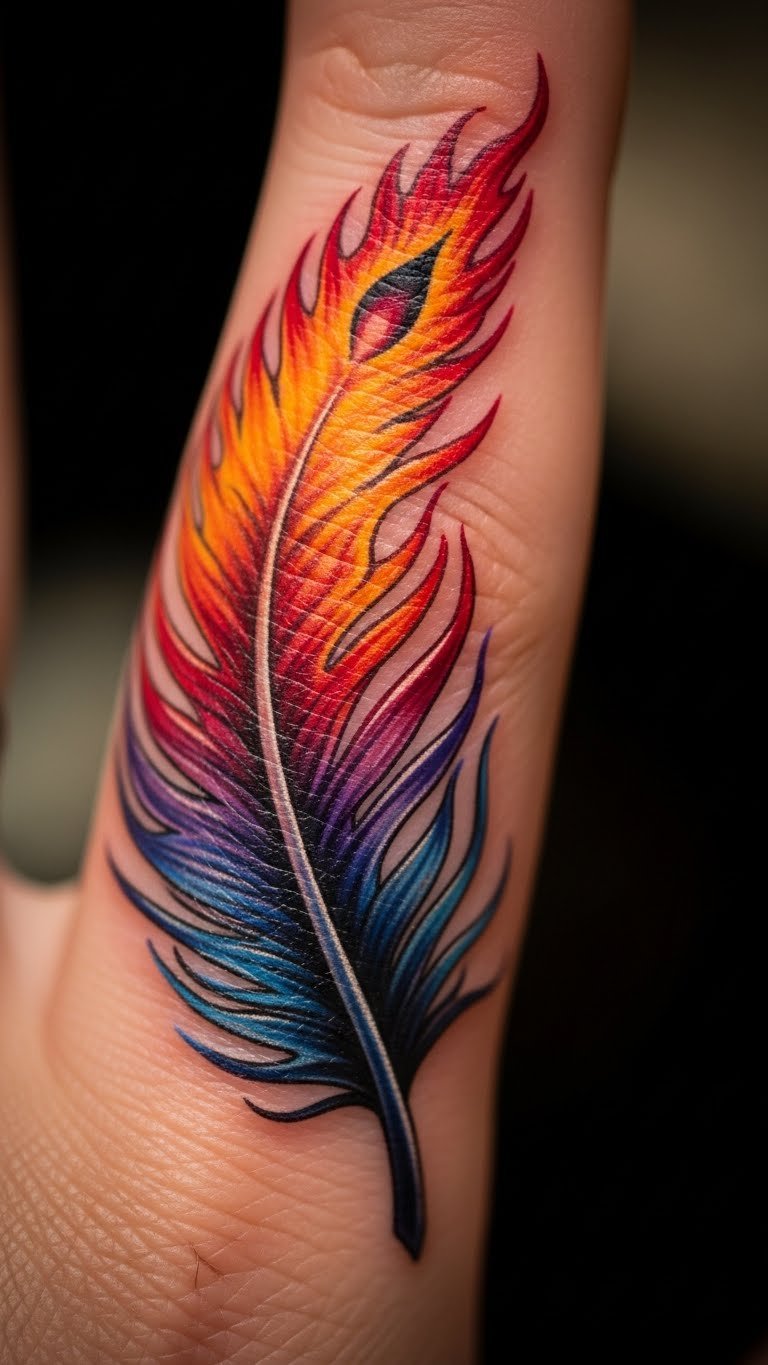 A phoenix feather on your finger shows rising from tough times. Picture flames wrapping the edges for a rebirth vibe. This design fits personal growth stories. Draw a simple flame-feather mix at home using markers. Find free apps for quick sketches. Choose a nearby shop for affordable ink. Place it on your finger to see it often. Keep the area clean with basic lotion. Mix this with daily affirmations for extra impact. Bold lines make it stand out. Test with temporary tattoos from stores.
