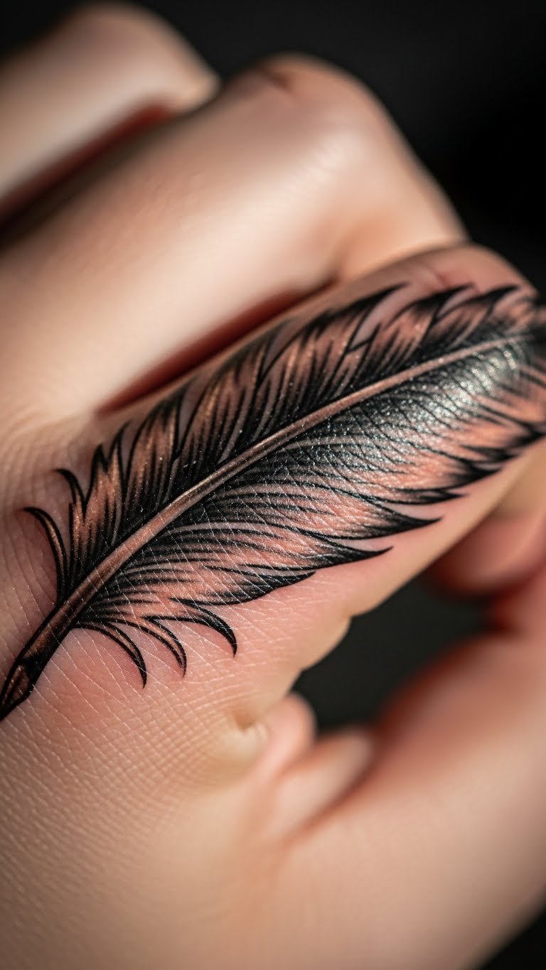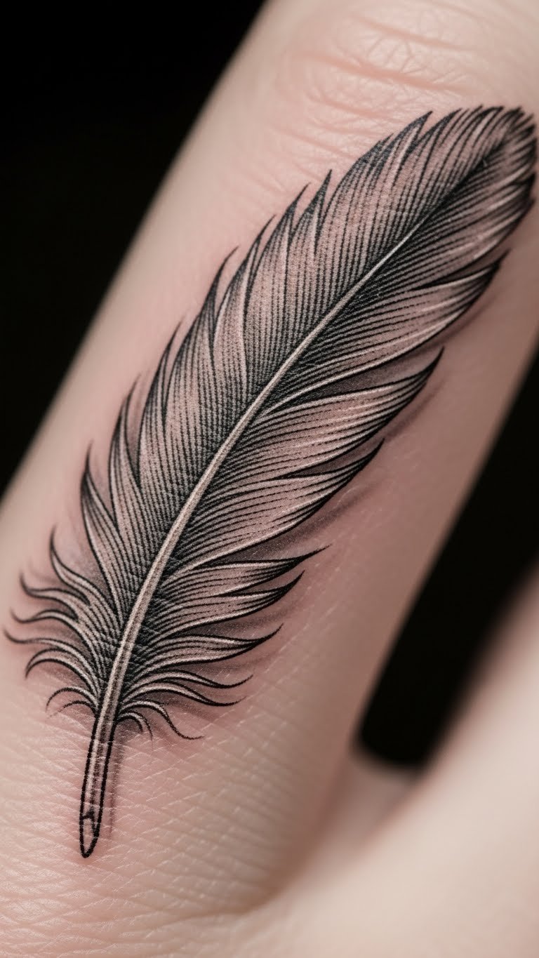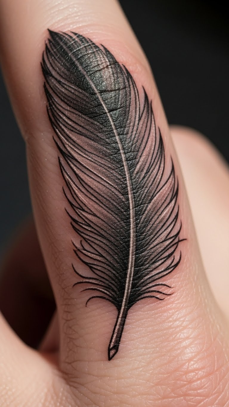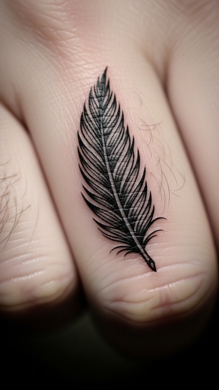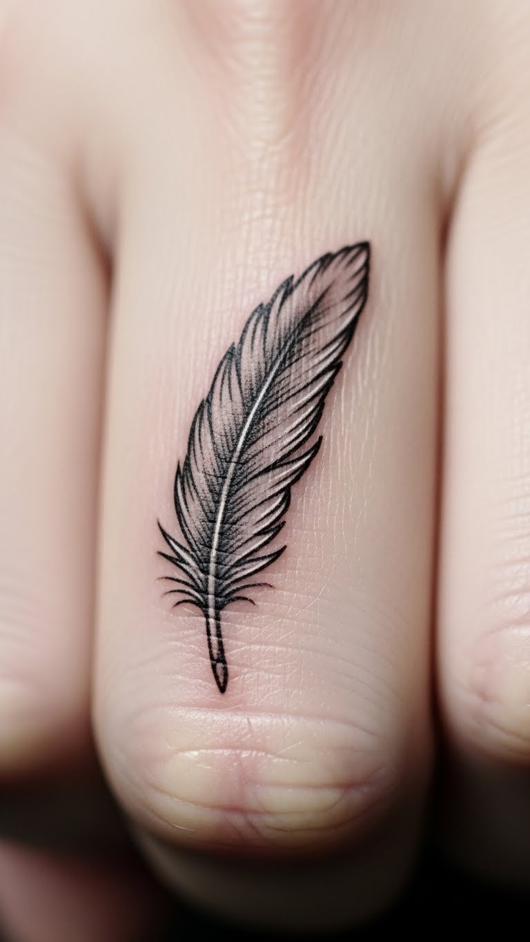 A minimalist feather on your finger keeps things straightforward and elegant. Think of a single line drawing that says “freedom” without extra fuss. You get a design that fits daily life. Start by sketching a basic feather shape on paper with a pen. Use online templates for ideas. This style costs less at the tattoo shop. Go for a local artist who offers budget sessions. Add it to your finger for a quick reminder. Bold choices like this last with simple care. Wipe the area gently each day. Pair it with your routine for meaning. Try drawing it on with henna first to test the look.