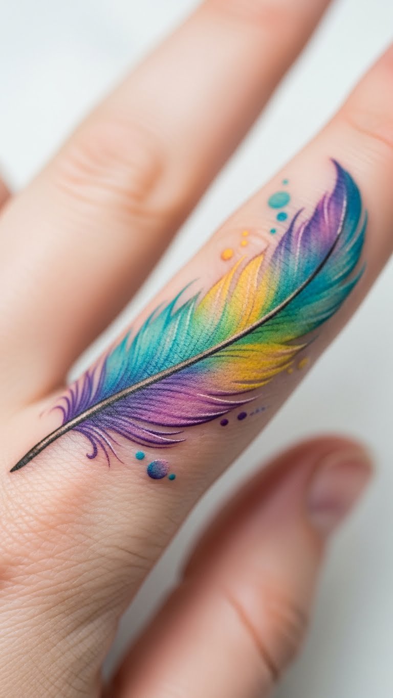 A watercolor feather on your finger mixes art and emotion. See blended colors that flow like paint. This design sparks creativity daily. Practice with watercolors on paper at home. Use free apps for color ideas. Choose an affordable artist for this look. Place it on your finger as an art piece. Keep it fresh with gentle washes. Link it to hobby time for joy. Bold hues make it lively. Try watercolor kits from stores.