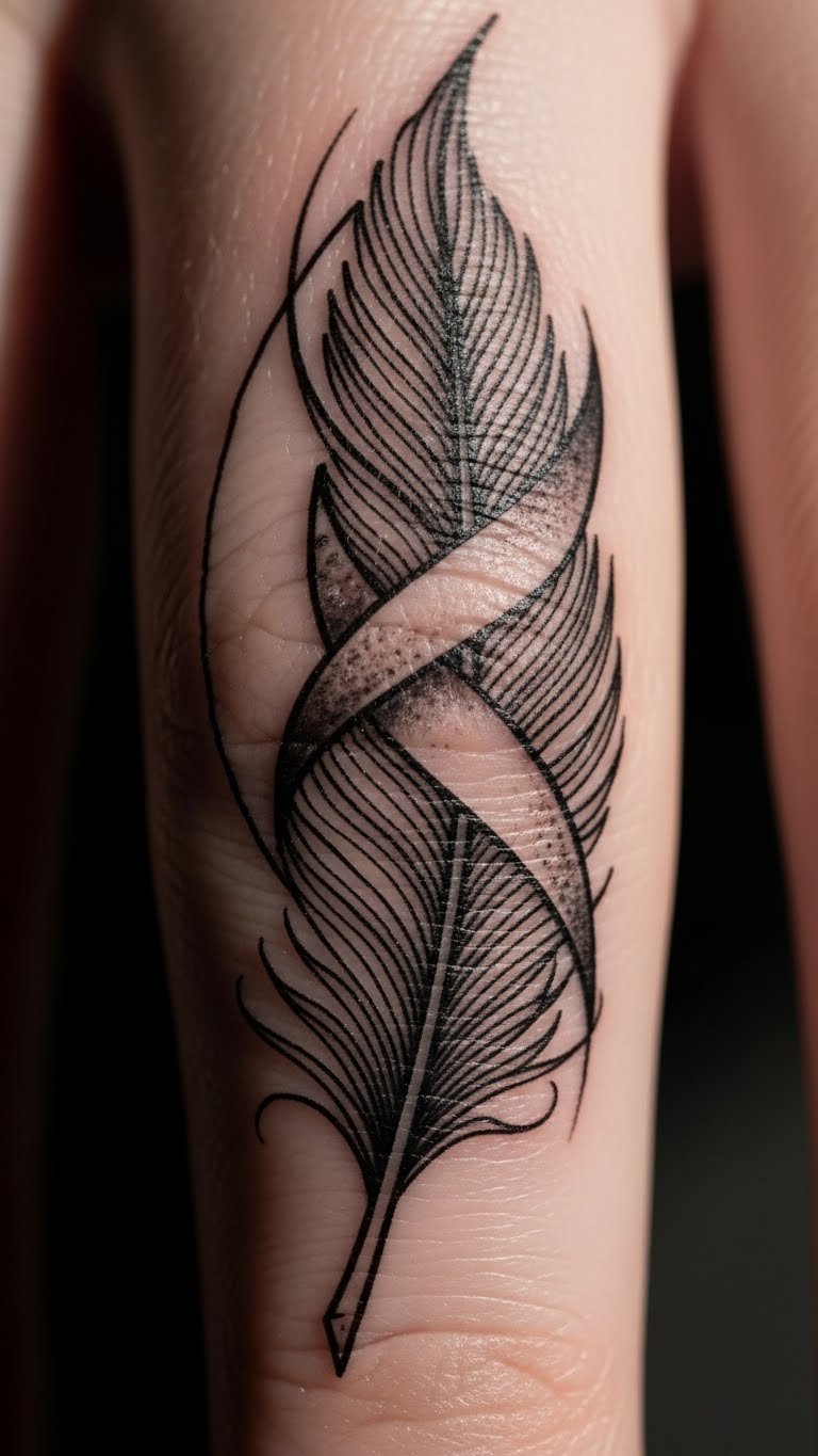 A geometric feather on your finger offers sharp style and precision. See angled shapes that align. This one adds modern flair. Sketch geometric forms with rulers. Find free shape ideas. Select a budget tattoo. Add it to your finger for edge. Use easy care. Tie to structured days. Bold geometry intrigues. Try puzzle pieces.