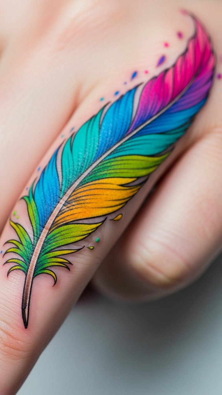 A colorful feather on your finger adds joyful days and energy. Think of rainbow shades that pop. This design brightens moods. Create color sketches with markers. Use online color palettes. Choose a low-cost tattoo option. Put it on your finger for fun. Maintain with gentle products. Link to happy activities. Bold colors pop. Test with face paints.
