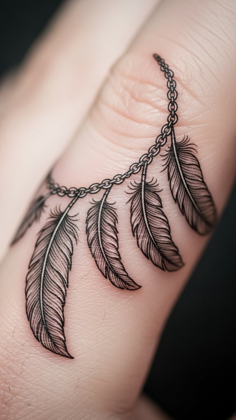 A feather chain on your finger links ideas and journeys. Imagine feathers in a row. This one builds connections. Draw chain sketches quickly. Use free link templates. Choose an inexpensive service. Place it on your finger for flow. Keep it clean. Pair with linked goals. Bold chains connect. Test with chain links.