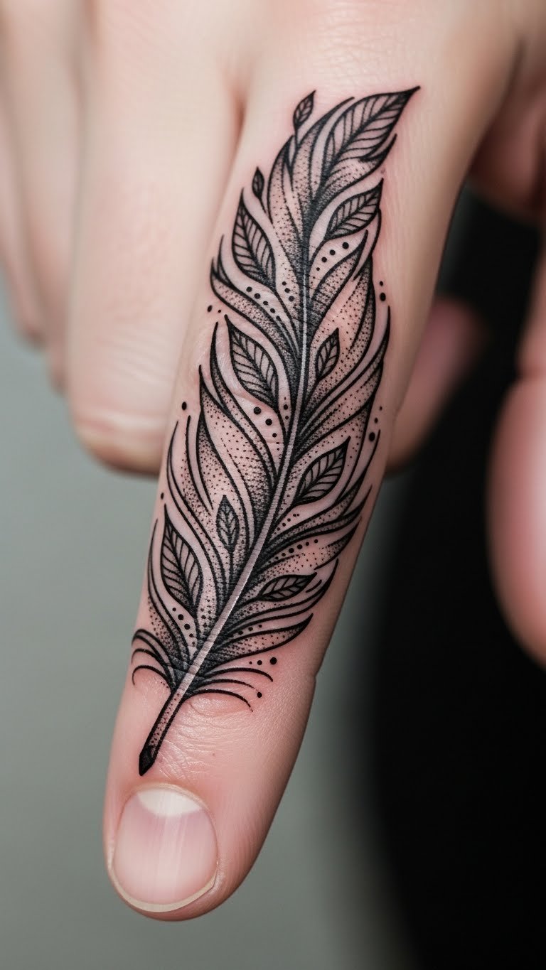 A nature feather on your finger ties to outdoor elements and earth. Picture leaves with the design. This one grounds you. Sketch nature scenes at home. Use free outdoor images. Pick a budget artist. Put it on your finger for connection. Maintain simply. Pair with hikes. Bold nature soothes. Experiment with leaf rubbings.