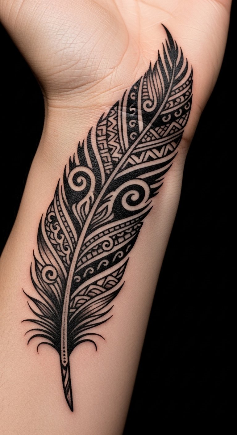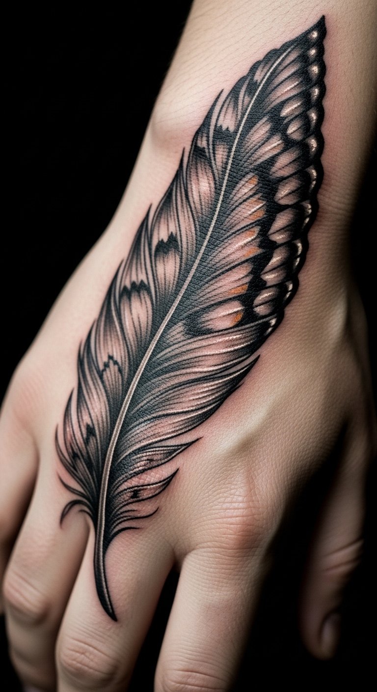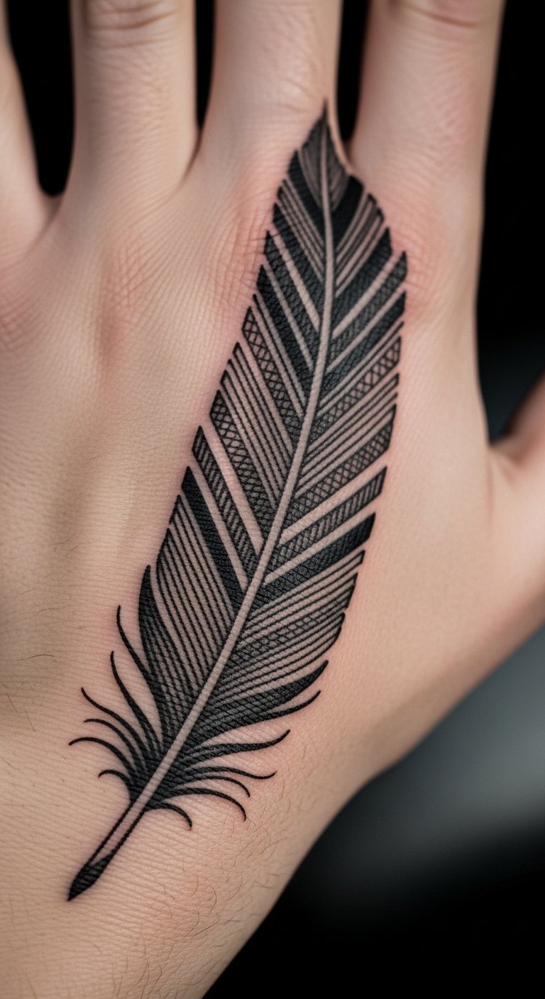 Try a geometric feather design on your hand for a modern edge. Shapes interlock to form the feather, making it bold yet neat. Put it on your knuckle to show it off casually. Find budget artists online who offer discounts for first-timers. Expect to spend less than $80 on a compact version. Draw grids on paper at home to plan your layout. This helps visualize the angles before committing. The tattoo adds structure to your daily routine. Use a ruler and pen for quick DIY mock-ups. Cover it with clothing if needed, but let it shine otherwise. Basic care like moisturizing keeps it looking good. This approach makes tattooing straightforward and fun.