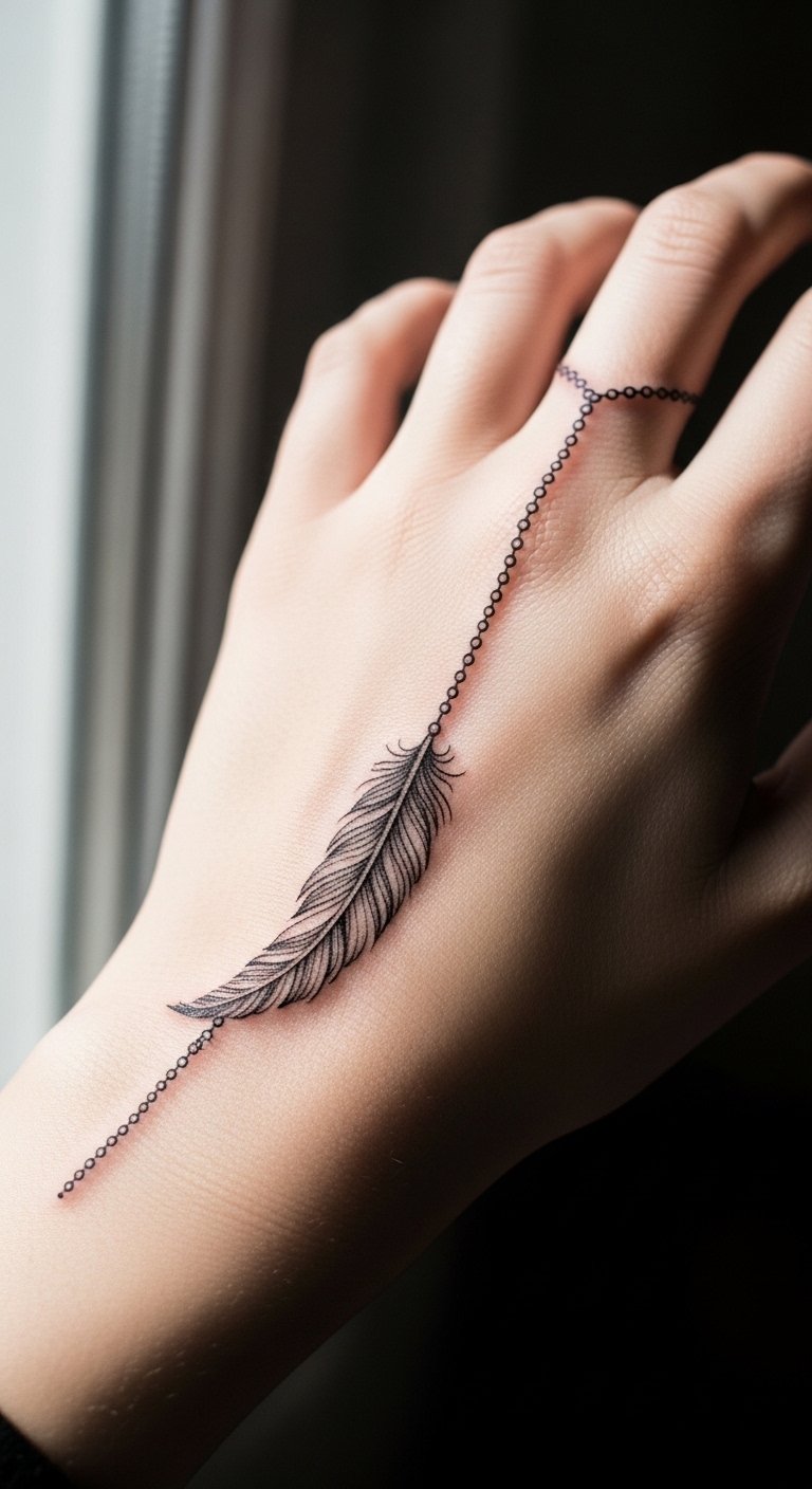 Go with a delicate chain feather on your hand for a linked look. Chains connect the feather parts smoothly. Try your finger for a dainty feel. Scout for student artist deals to reduce costs. Keep it petite at around $45. Chain drawings with thread at home for practice. This shows how it drapes. The tattoo adds a fine touch to your hand. Use yarn from your supplies for tests. Cover with rings you own. This keeps it simple and budget-friendly.