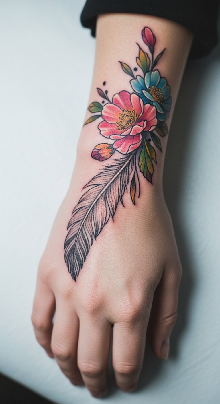Add a floral accent feather to your hand for a nature vibe. Flowers dot the feather for extra charm. Try your wrist for a blooming look. Look for group session discounts. Aim for under $85 with flowers included. Draw flowers with markers at home. This tests the combination. The tattoo brings nature closer. Use garden sketches for ideas. Protect with natural fabrics. This design is easy to love.