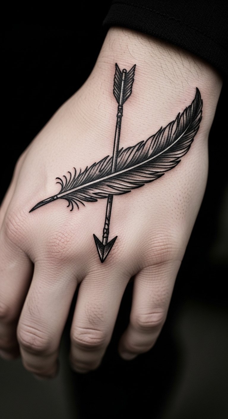 Go for an arrow through feather on your hand for direction. The arrow cuts through for a straight path feel. Place it on the back of your hand. Check for loyalty programs at studios. Keep it concise at $60. Draw arrows with rulers at home. It clarifies the design. This tattoo guides your choices. Practice with sticks. Cover as required. This keeps it practical.