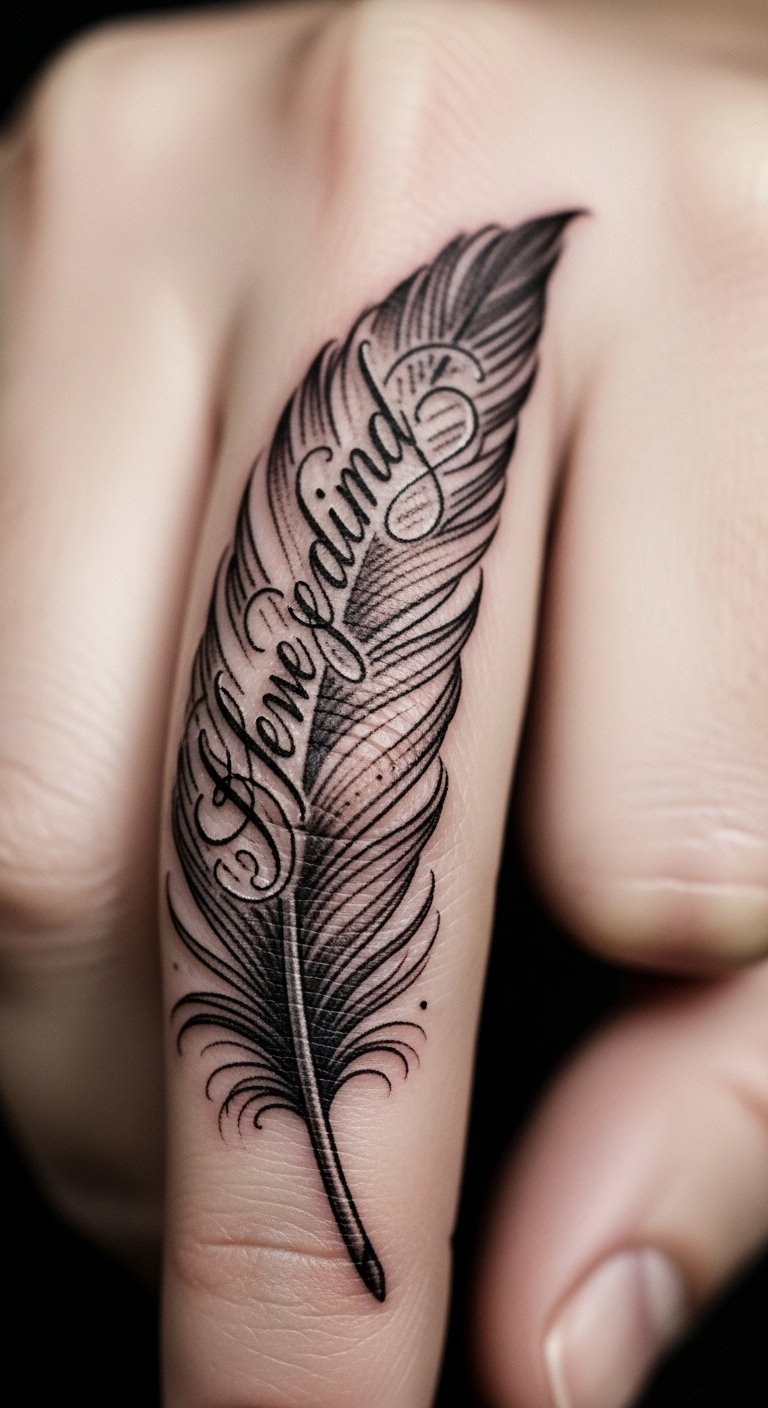 Pick a script word feather for your hand to add words. Script weaves into the feather for personal notes. Try your finger for quick reads. Search for flash designs at lower prices. Go for a word at $40. Write scripts with pens at home. This personalizes it. The tattoo shares your message. Use notebooks for drafts. Keep it visible or not. This is a direct way.