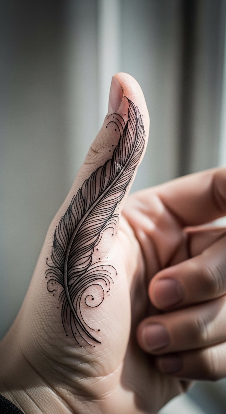 Think about starting with a basic black outline feather on your hand. It looks clean and fits any style. You get a tattoo that says freedom without much fuss. Pick a spot like your finger or palm for easy hiding. Go to a local shop during off-peak hours to save money. Ask for a small design to keep costs under $50. Try sketching it first on paper with a pen. This helps you see how it flows. Wear it daily and watch how it adds a touch of grace. Clean the area with soap and water before going in. Choose an artist who uses fresh needles for safety. This way, you avoid issues later. Add a personal twist, like a small bird next to it. It makes the tattoo your own story. Keep sessions short to handle any discomfort. After, protect it with lotion from your cabinet. Simple choices like this make tattooing fun and affordable.