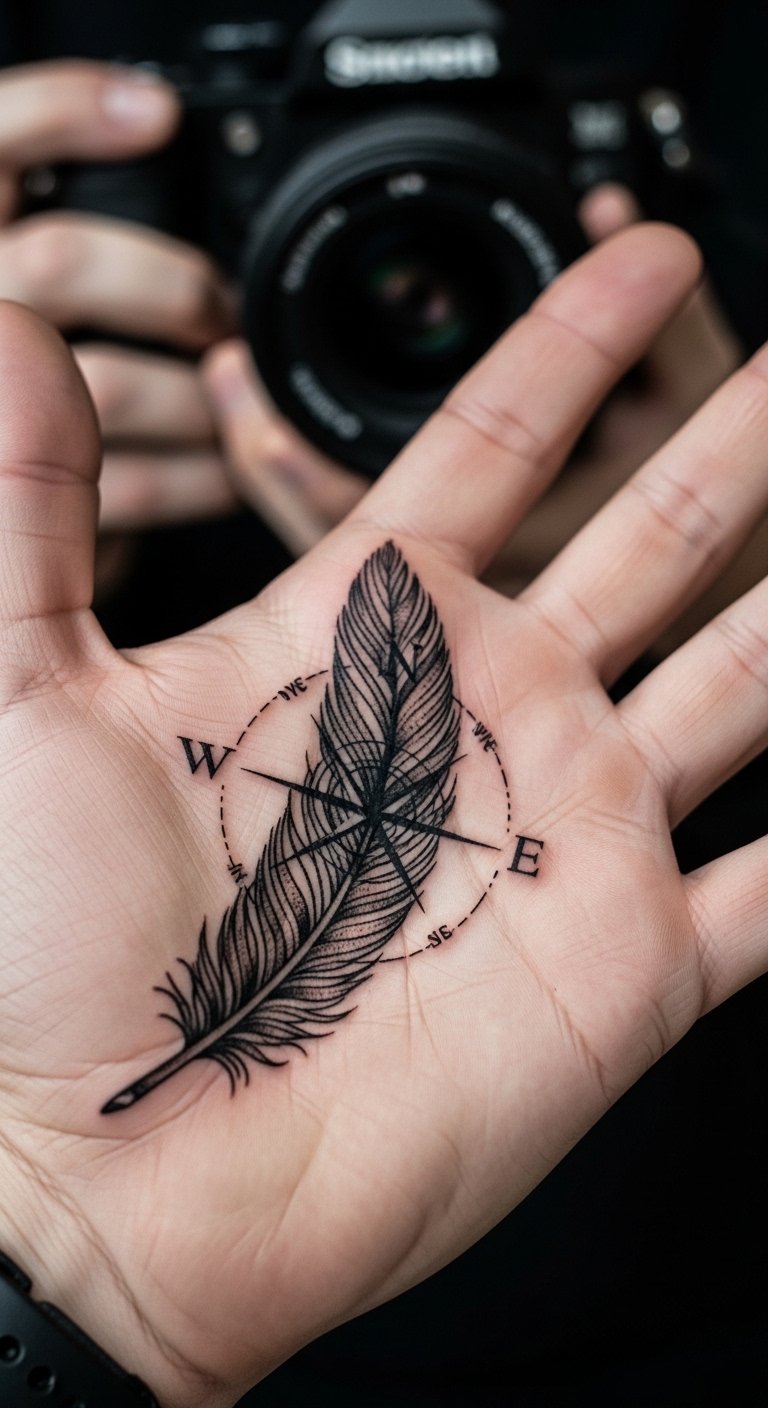 Pick a compass direction feather for guidance on your hand. Directions point in the feather for paths. Put it on your palm for navigation. Search for travel-inspired discounts. Aim for directions at $70. Direction drawings with compasses at home. This points ideas. The tattoo guides choices. Try with map tools. Protect from sun. This is a directional pick.