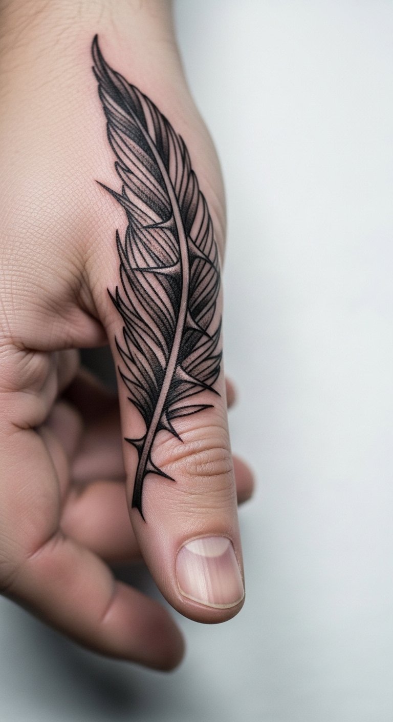 Go for a rose thorn feather on your hand for beauty with edge. Thorns line the feather for contrast. Place it on your thumb for a prickly touch. Find flower pattern sales. Keep it thorny at $55. Thorn drawings with roses at home. This roses your thoughts. The tattoo blends soft and sharp. Use petal sketches. Cover if sensitive. This design is balanced.