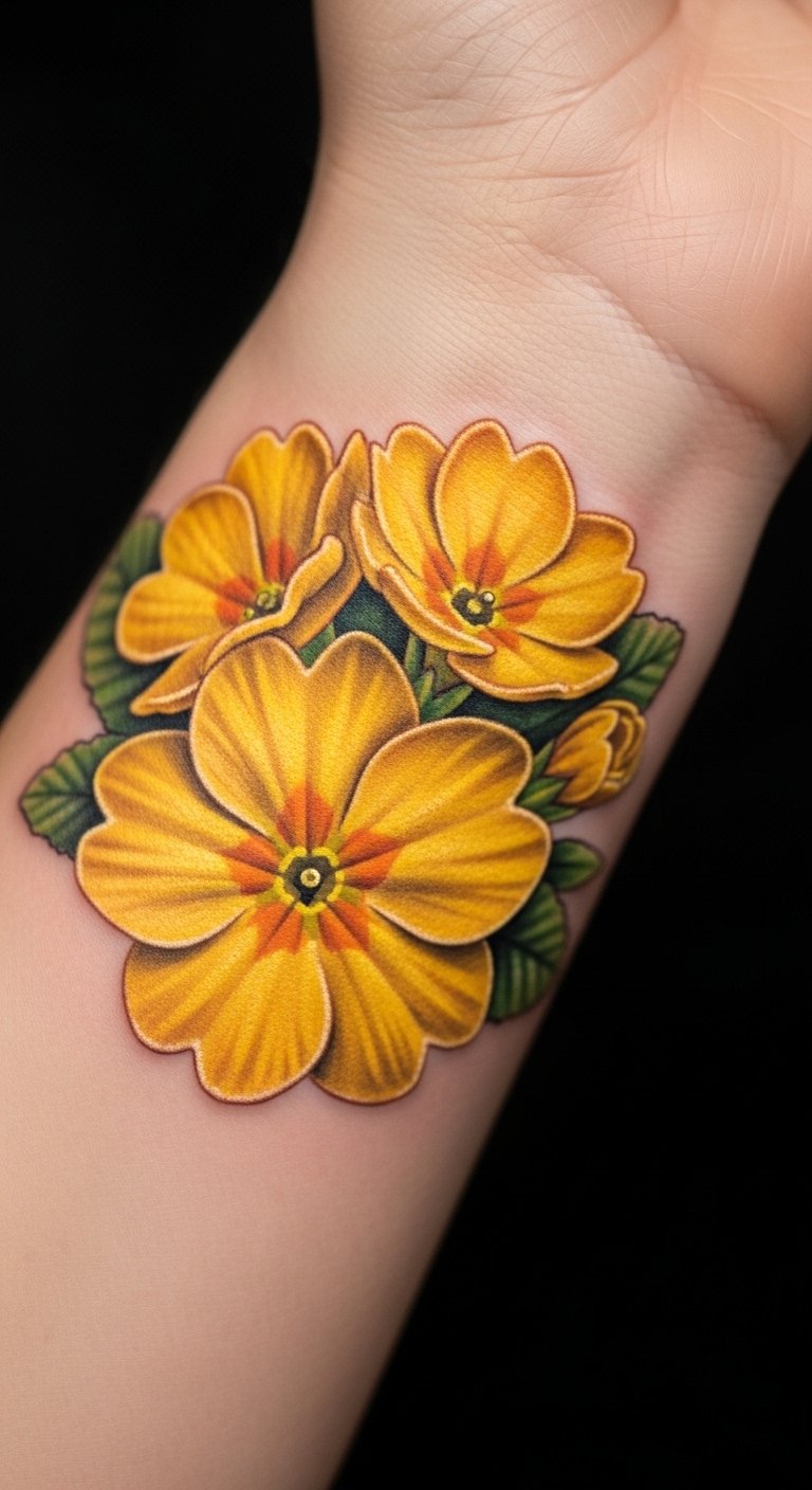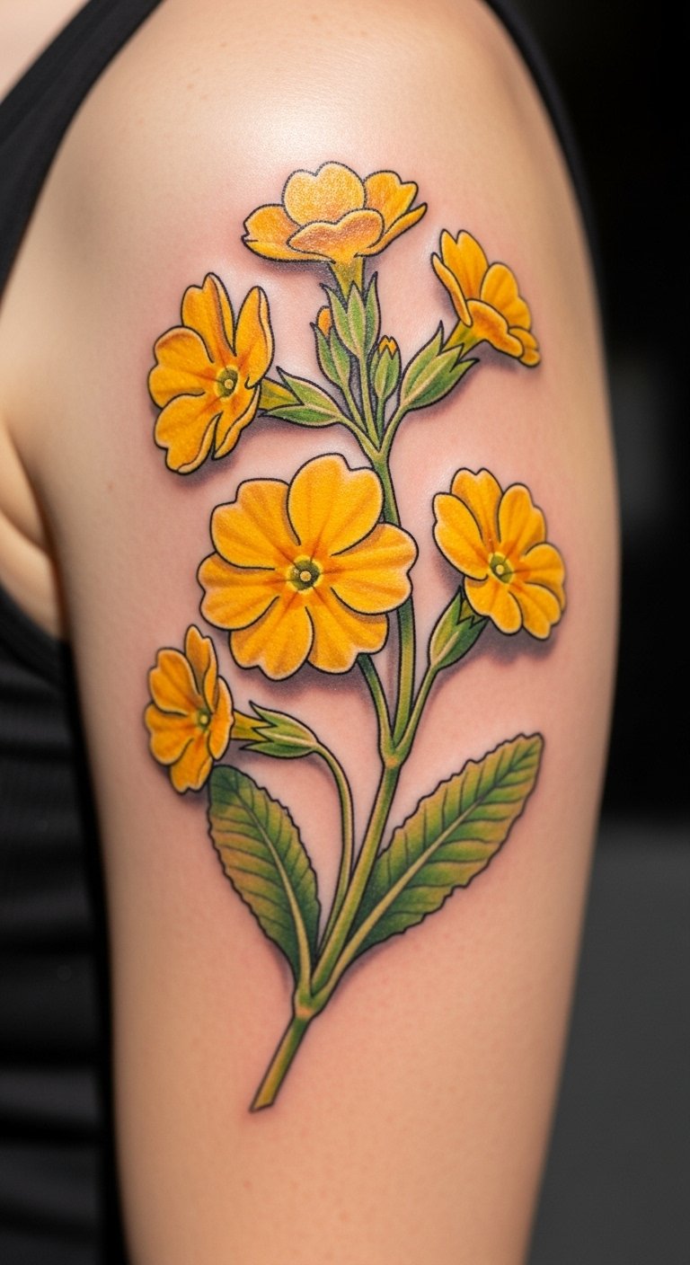 Yellow primrose tattoos brighten up. Use yellow markers for previews. This choice lifts spirits cheaply. Pick wrist for show. Online colors guide. Add shades with ease. These tattoos spark joy.