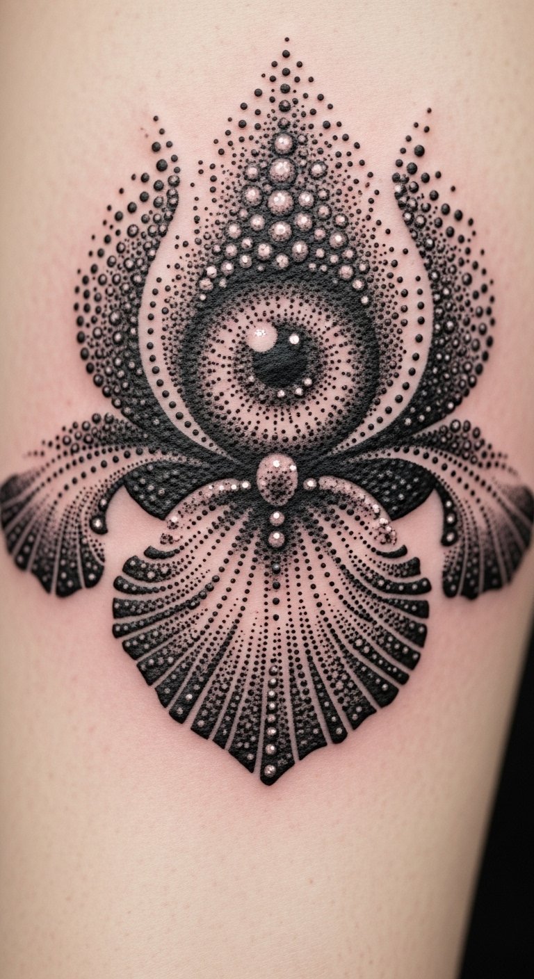 Dot work iris adds texture. Dot paper with a pen first. This technique is approachable. Go for leg space. Tutorials teach basics. Practice with punches. These tattoos build depth.