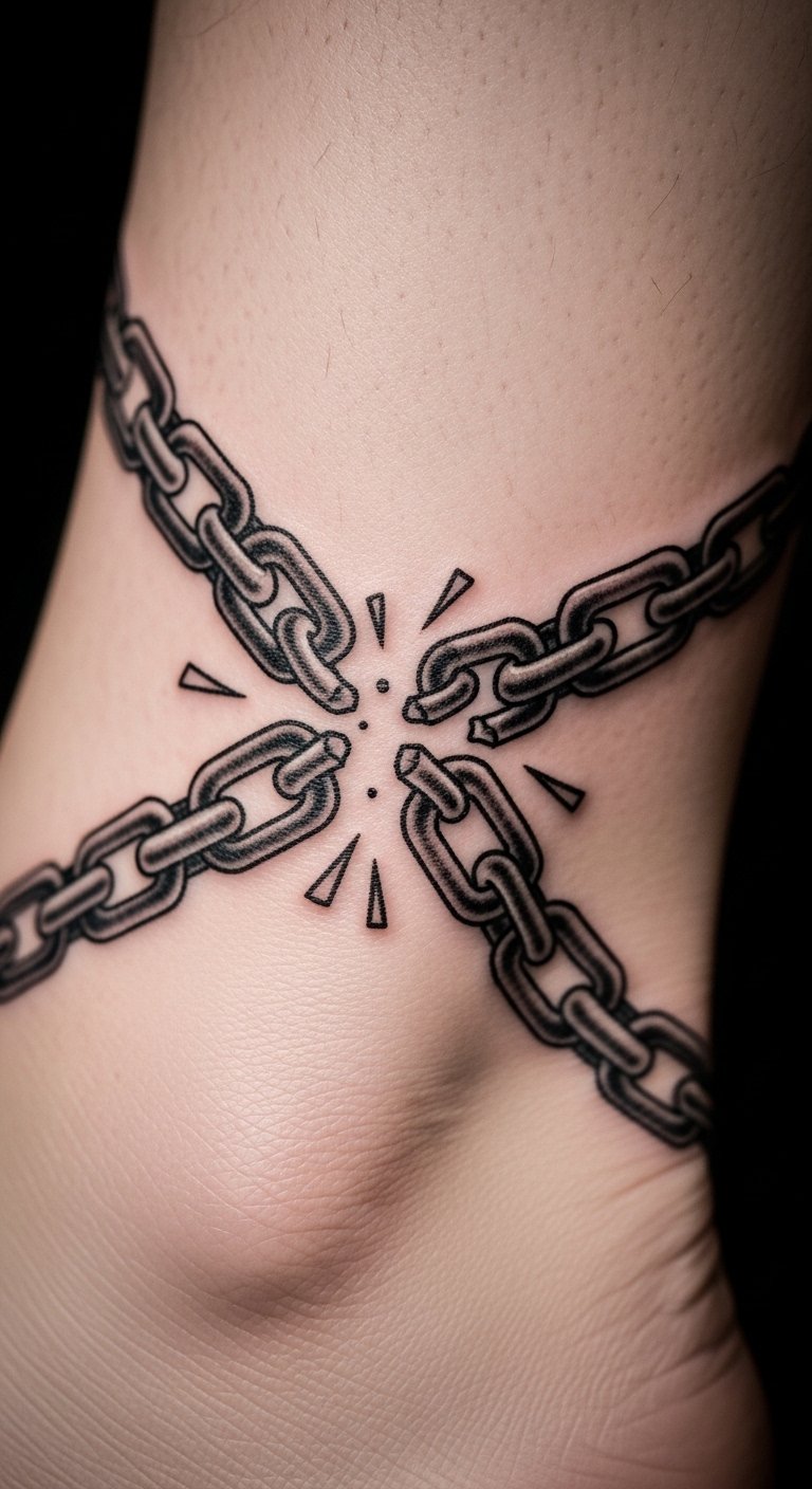 Breaking chains ink frees the spirit. Draw chains breaking. Use online freebies. Cost around $60. Spot on ankle. Practice with paint. It shows release. Add cracks.