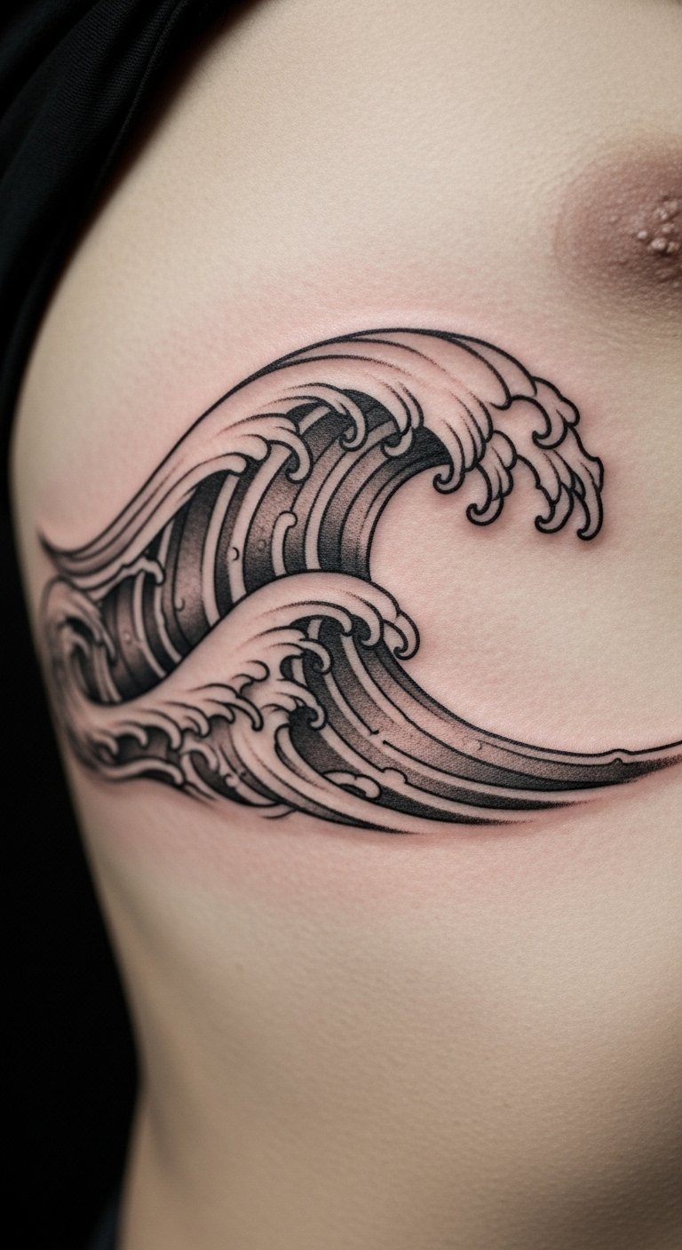 Wave patterns build resilience. Jot waves down. Find free patterns. Spend $70. Place on rib. Test with body art. It represents flow. Keep waves even.