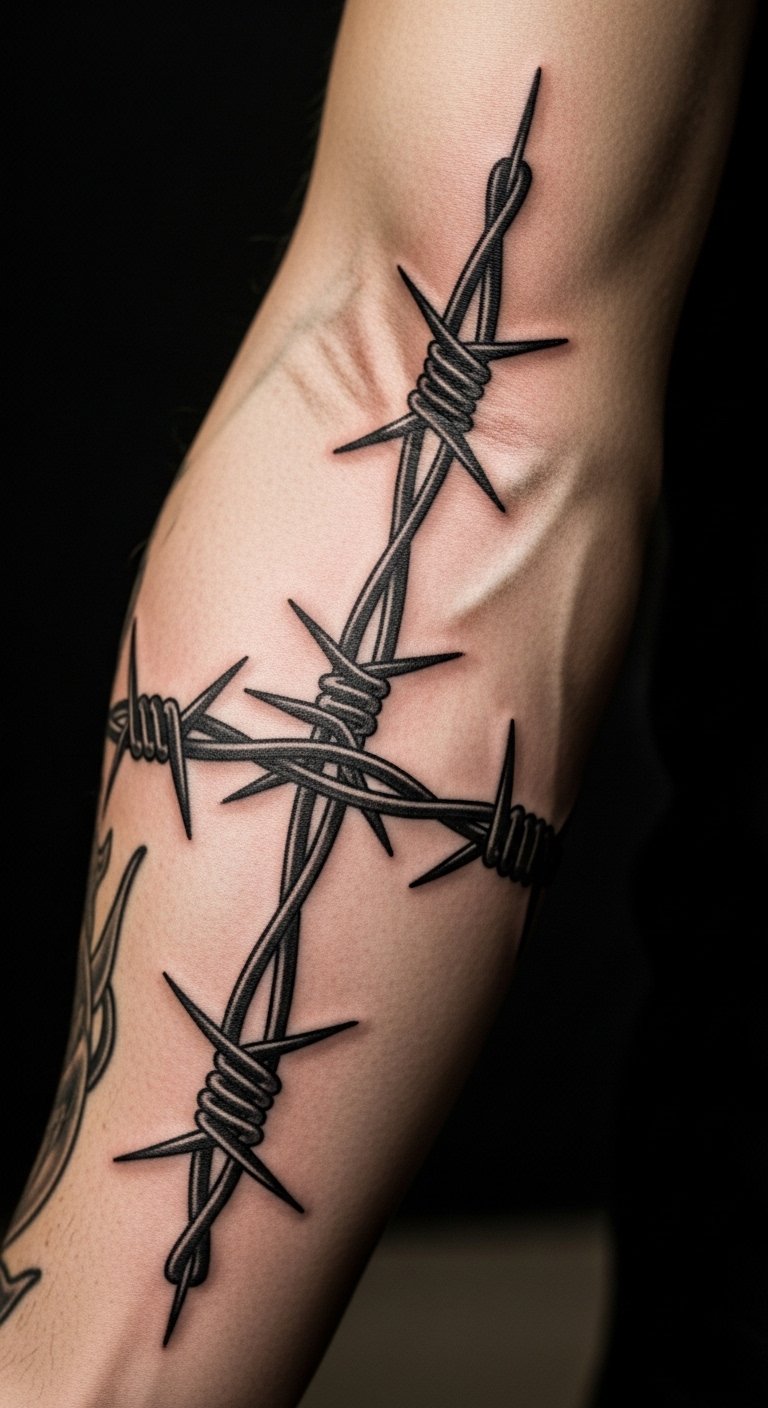 Barbed wire adds edge. Sketch wires. Use free stencils. Budget $70. Put on arm. Practice safely. It means protection. Add barbs.