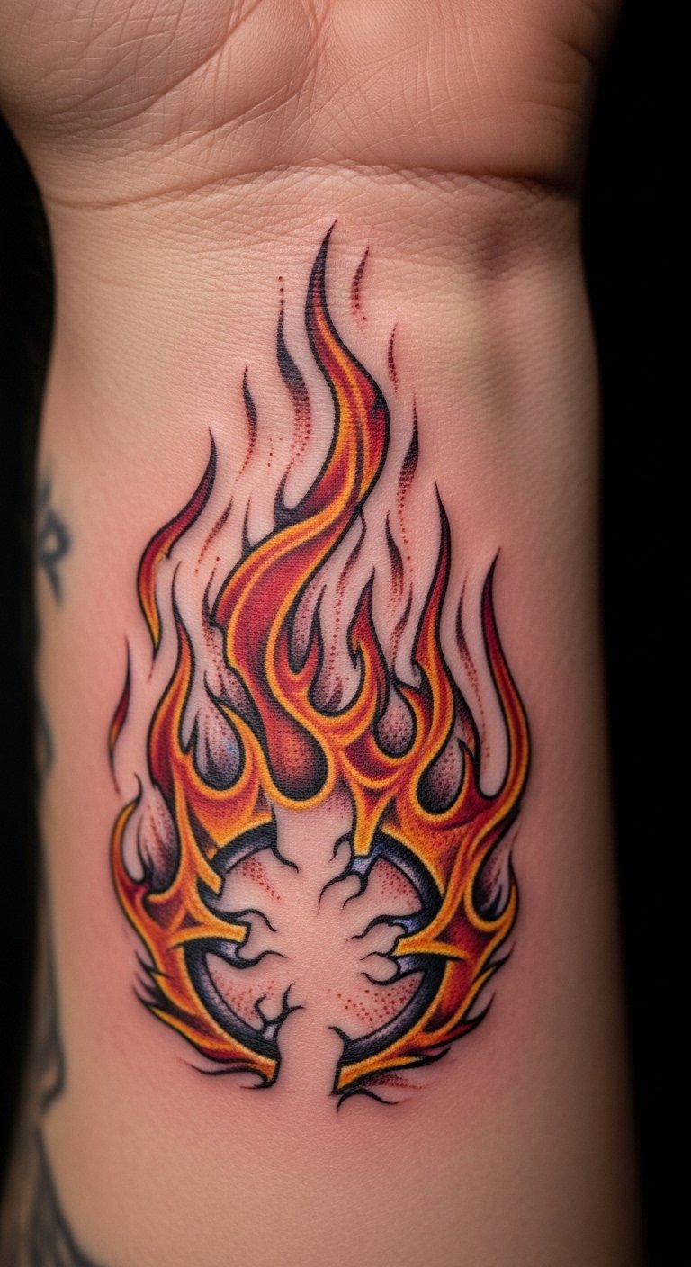Flame tattoos ignite passion. Draw flames. Get free fire designs. Cost $60. Spot on wrist. Use candle wax practice. It means burning away old ways.