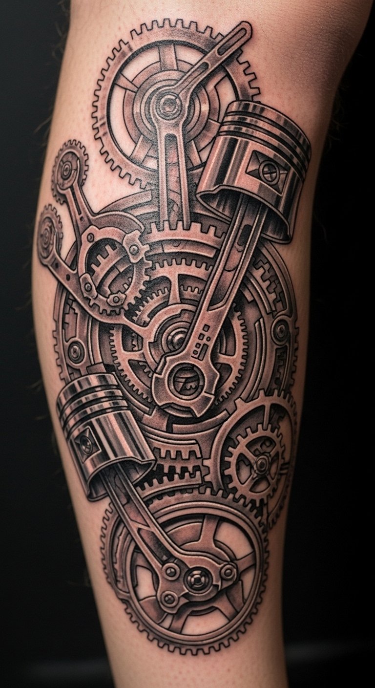 Gear tattoos show mechanics of change. Sketch gears. Find free mech designs. Spend $90. Place on leg. DIY with tools. It means moving forward.
