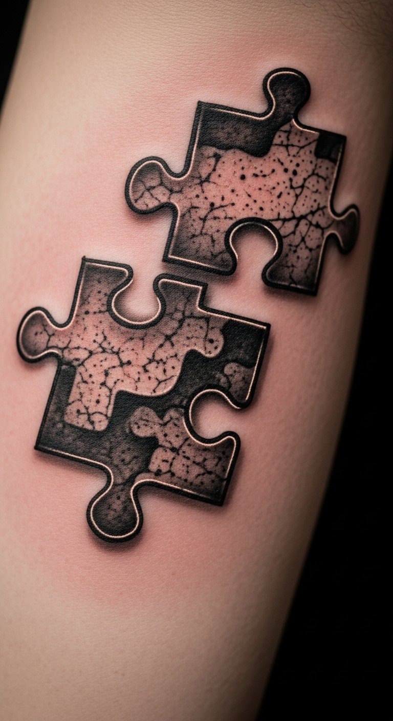 Puzzle pieces fit your story. Draw pieces. Use free puzzle art. Budget $60. Put on arm. Test with puzzles. It completes you. Add connections.