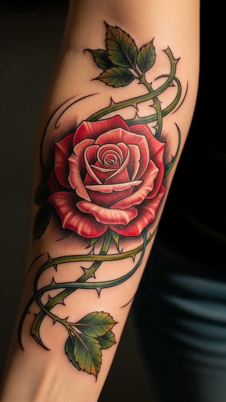 Roses stand for love and strength. A wraparound on your forearm creates a seamless flow. Start with a simple sketch at home. Grab paper and pencils for under $5. Practice drawing curves to match your arm. Find an artist online who does floral ink. Check their past work for ideas. A small rose keeps costs low, around $50 to $100. Go for black ink if color adds expense. Try a temporary tattoo first. Buy stickers from stores for $2 each. They last a week and let you test the spot. Mix in leaves for extra flair. Keep it personal, like adding a date. This design fits daily wear and hides easy. Choose a spot near the wrist for less pain. Get friends’ opinions before deciding. Enjoy the process and make it yours.