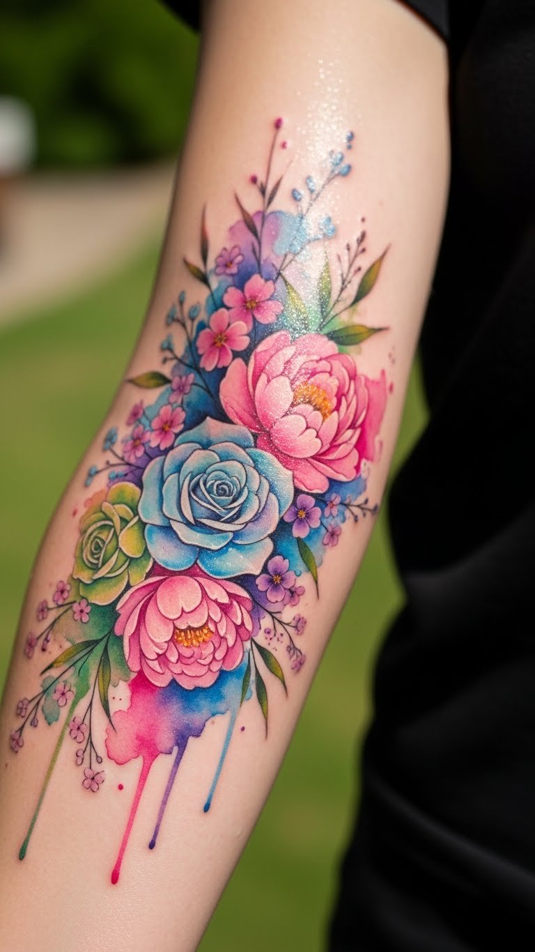 Watercolor tattoos mimic paint splashes. They bring a fresh, artistic feel to your forearm. Pick flowers like sunflowers for brightness. Draw them freehand with markers at home. A set costs less than $10. Look for tutorials on free video sites. Find artists who specialize in this style. Search local shops for affordable options. A basic design might run $80. Opt for fewer colors to save money. Try washable paints on your skin first. They wash off and help you visualize. Add personal touches, like a favorite bloom. This tattoo works well for sleeves or alone. Place it midway on your arm for balance. Cover it with clothing if needed. Share ideas with friends for inspiration. Make it a fun project and see how it feels.