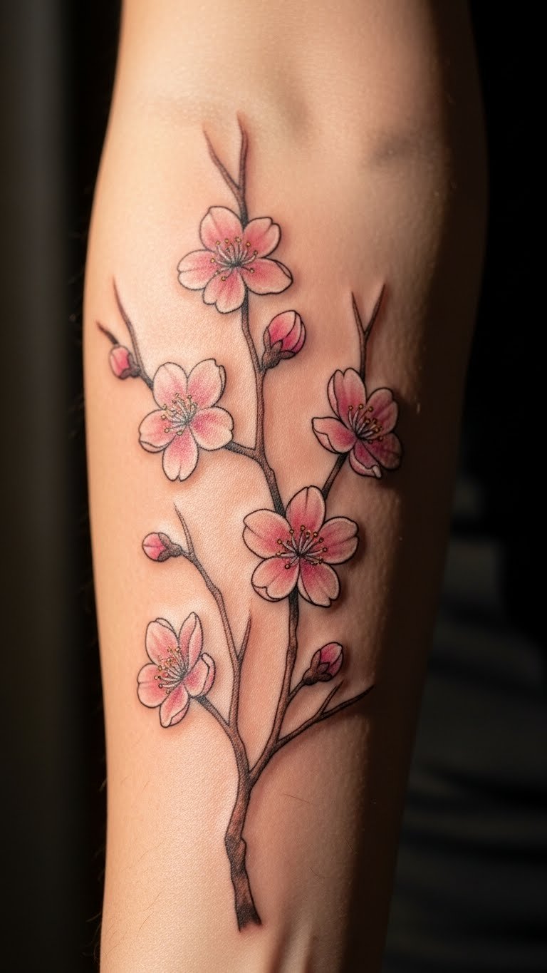 Cherry blossoms mean new beginnings. A branch design adds grace to your forearm. Practice drawing branches with a pen. It costs nothing extra. Use free online templates. Search for artists focused on delicate work. Compare their fees online. A simple branch is about $70. Go monochrome to save. Test with henna kits from stores, priced at $5. Apply it yourself for a trial. Include falling petals for whimsy. This fits the inner forearm well. It offers a subtle charm. Discuss with friends for tweaks. Make it a personal favorite.