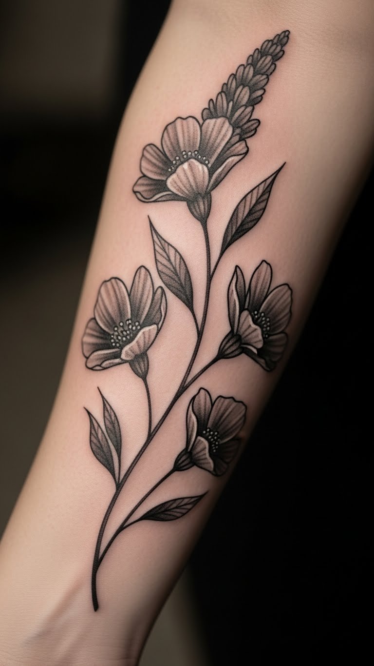 Wildflowers in black and gray feel timeless. They suit your forearm perfectly. Sketch them in pencil first. Supplies are minimal. Watch shading videos for free. Seek gray-scale artists. Check local options for rates. A set might cost $70. Use simple shades to save. Try graphite drawings at home. Pencils cost little. Group flowers for interest. Place along the arm for flow. It works under clothes. Ask friends for thoughts. Make it a classic pick.
