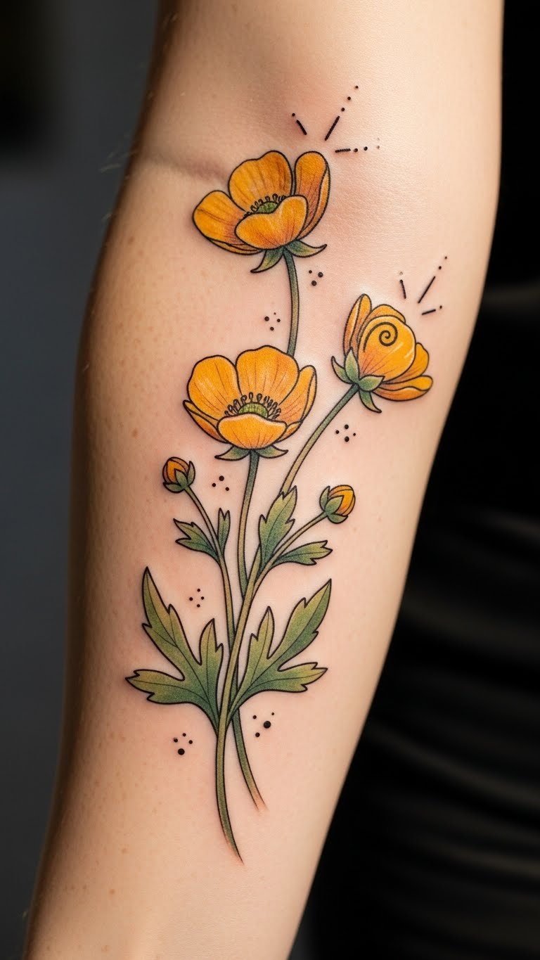 Buttercups bring a fun, illustrative vibe. This design livens up your forearm. Illustrate with fun markers. A pack is $3. Use free drawing apps. Search for illustrative artists. Check their fees. It could be $80. Opt for flat colors. Practice with kid’s crayons. They’re inexpensive. Add cartoon elements. Put it on the outer arm. It sparks joy. Share for laughs. Enjoy the whimsy.