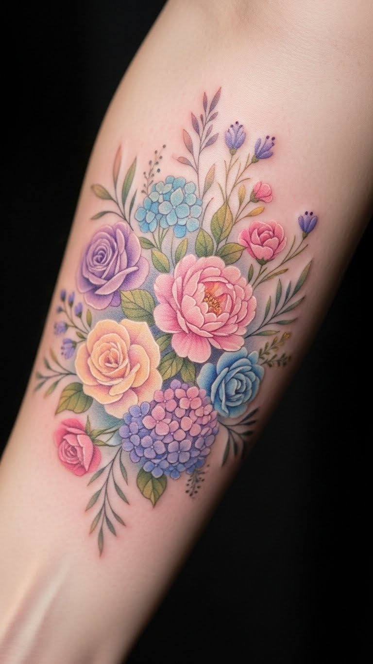 Pastel gardens create a soft paradise. They beautify your forearm sweetly. Color flowers in pastels at home. Crayons are $2. Use free color palettes. Seek pastel artists. Check for deals. This might be $80. Limit shades. Try pastel chalk drawings. They’re affordable. Group various flowers. Place along the arm. It feels light. Share ideas. Make it charming.