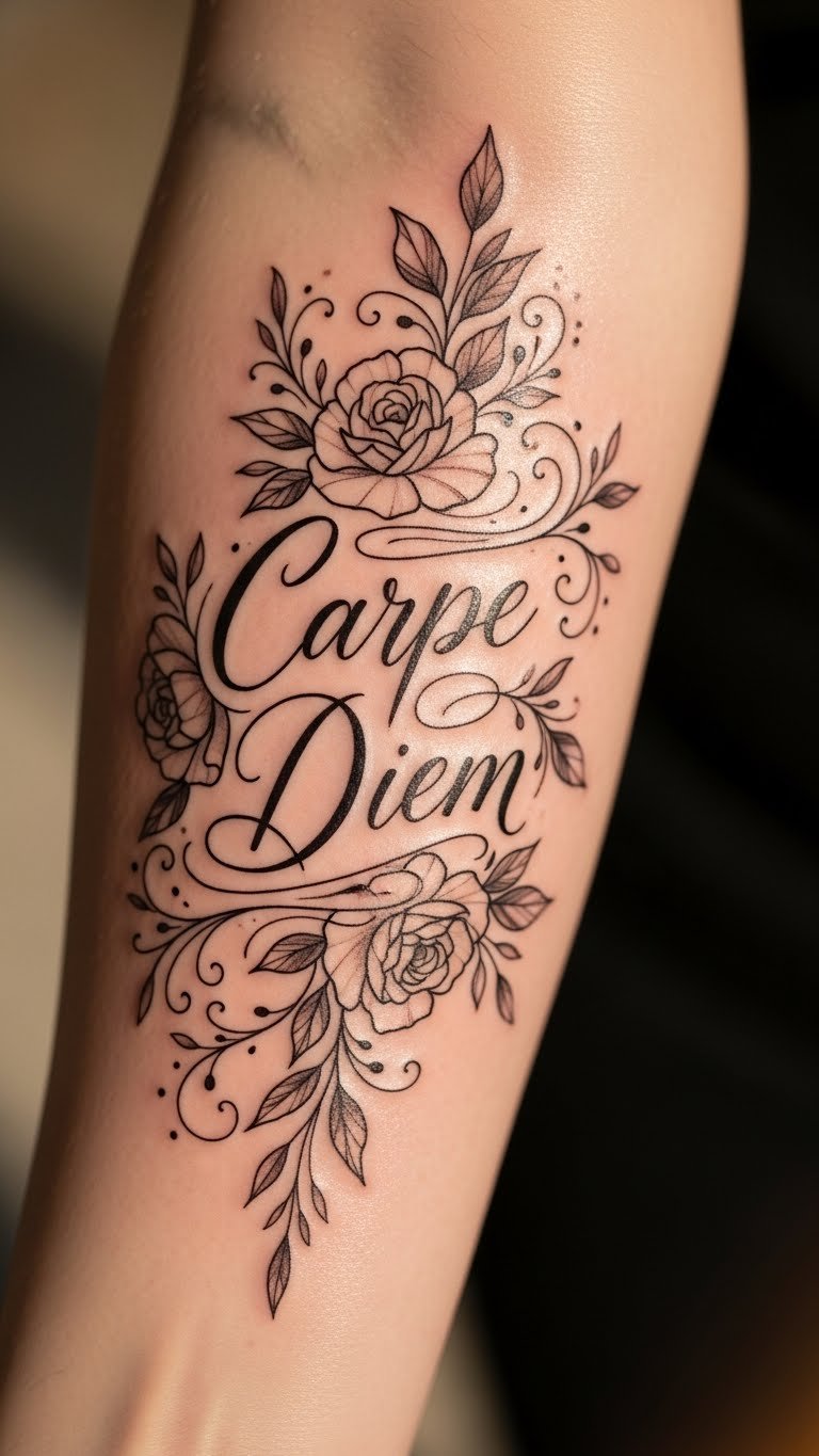 Script with flowers personalizes words. They decorate your forearm nicely. Write scripts with markers. One is cheap. Use font generators. Find script artists. Review options. This might be $60. Keep text short. Try word stickers. They’re under $1. Weave in flowers. Place for easy read. It means something. Share your phrase. Make it special.