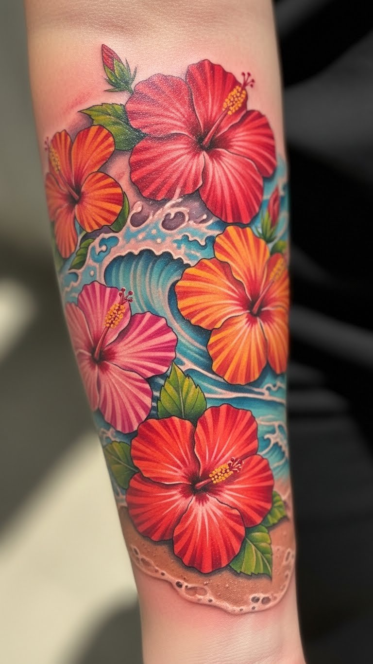 Hibiscus brings beach energy. It brightens your forearm. Draw hibiscus with tropical colors. Markers are $2. Find beach designs. Locate tropical artists. Review prices. It could be $80. Keep it basic. Practice with sand art. It’s fun and free. Add wave elements. Put it on display. It evokes vacations. Get tropical ideas. Enjoy the escape.