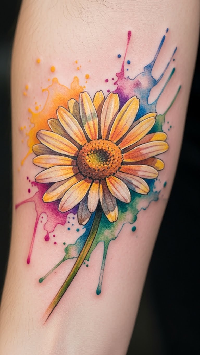 A daisy in watercolor style brings fun to your arm. Picture soft colors that fade like paint. Draw inspiration from nature photos online. Use watercolors at home to practice the look. Find an artist who uses fewer sessions to cut expenses. Opt for one or two shades to stay budget-friendly. Place it mid-forearm for balance. This design pops in summer light. Experiment with a temporary tattoo kit first. Keep the size modest for less time in the chair. It adds a light vibe to your everyday style.