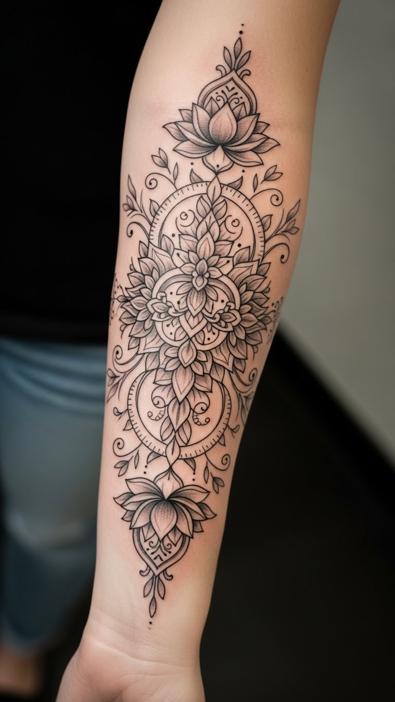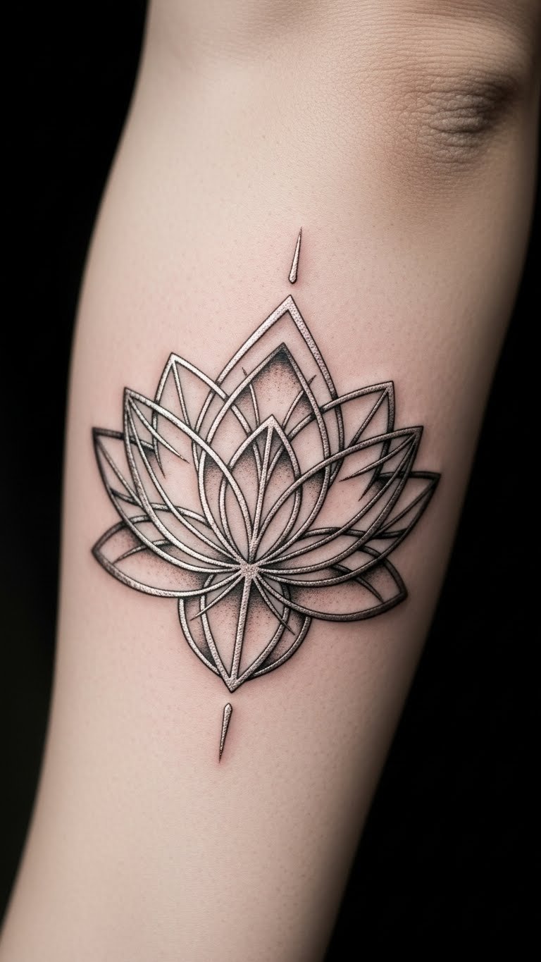 Go for a lotus with geometric twists for a modern edge. Sharp shapes make it stand out without fuss. Grab graph paper to sketch your pattern at home. Free apps help align the shapes just right. Choose a studio with quick geometric experts to save cash. Stick to black outlines for an affordable option. Put it on the inner forearm for a personal spot. This design works well with other tattoos. Test it with henna or a marker DIY. Aim for a small scale to finish fast. It gives your arm a structured cool factor.