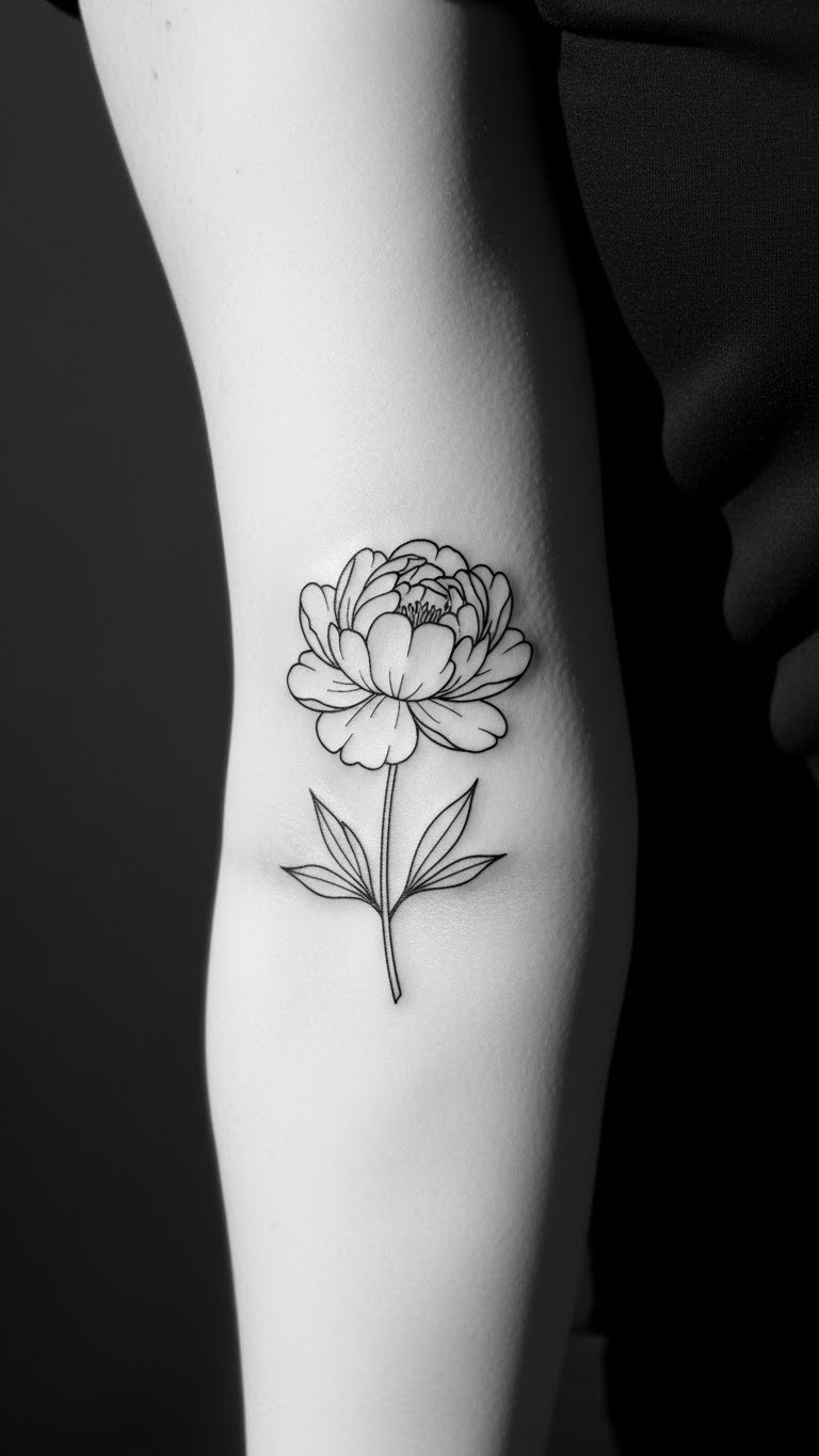 A peony outline keeps things straightforward and pretty. Basic curves form the flower shape. Draw peonies from books at home. Free drawing software helps refine your outline. Go to a shop that specializes in line art for less cost. Stick with single-color ink to stay affordable. Put it near the wrist for a discreet spot. This design holds meaning without overwhelming. Try tracing it on your skin with a pen. Opt for a small size to wrap up fast. It gives your forearm a touch of grace.