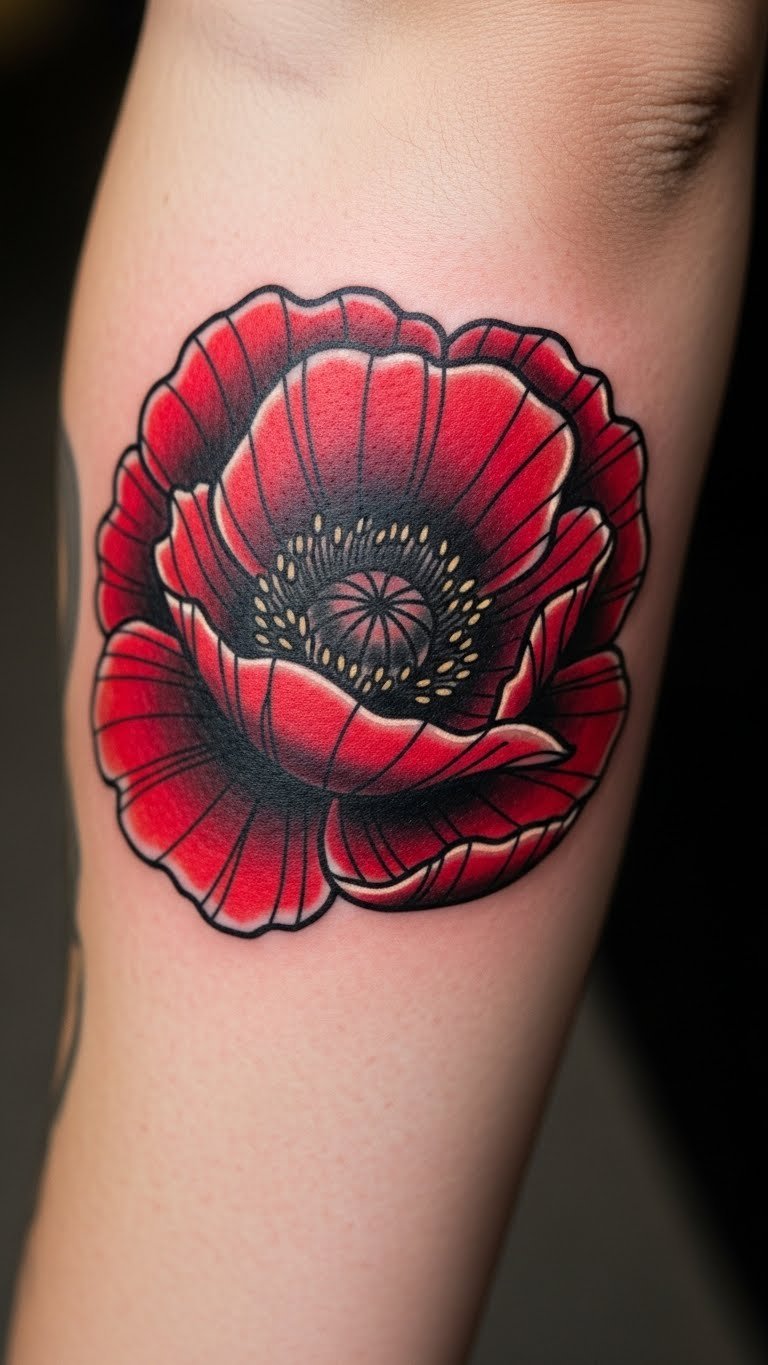 Poppies with bold lines make a strong impression. Thick strokes pop against your skin. Look at poppy images online for ideas. Create a bold version with markers at home. Find artists who do bold work in fewer hours. Use red ink sparingly to cut expenses. Place it on the top of your forearm for impact. This tattoo stands out in crowds. Experiment with fabric paints on cloth first. Keep the motif simple for a swift session. It adds energy to your style.