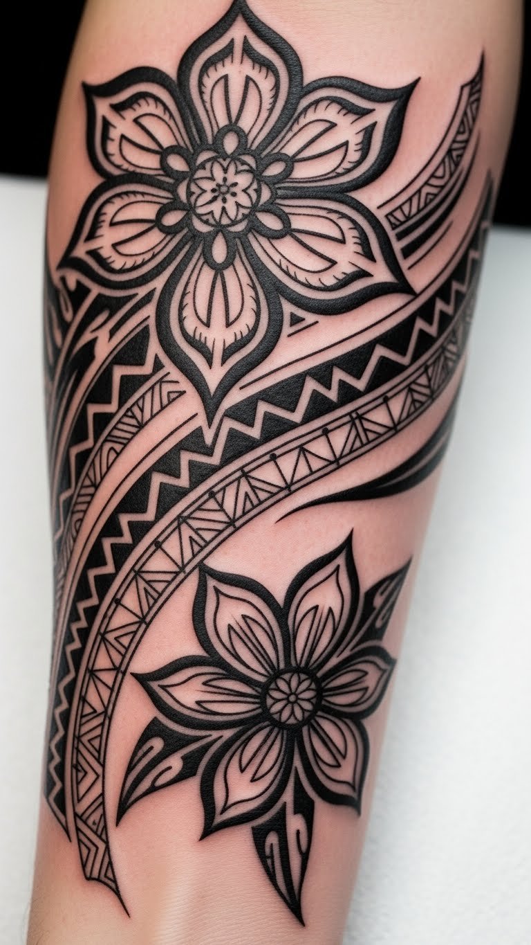 Tribal flowers add cultural flair to your arm. Bold patterns give a rooted feel. Research tribal designs online for free. Draw them with a simple pencil at home. Find artists who know tribal styles without high prices. Go with black patterns to keep it cheap. Set it on the forearm side for strength. This tattoo tells a story. Use string art as a DIY preview. Aim for balanced size to make it efficient. It connects your style to tradition.