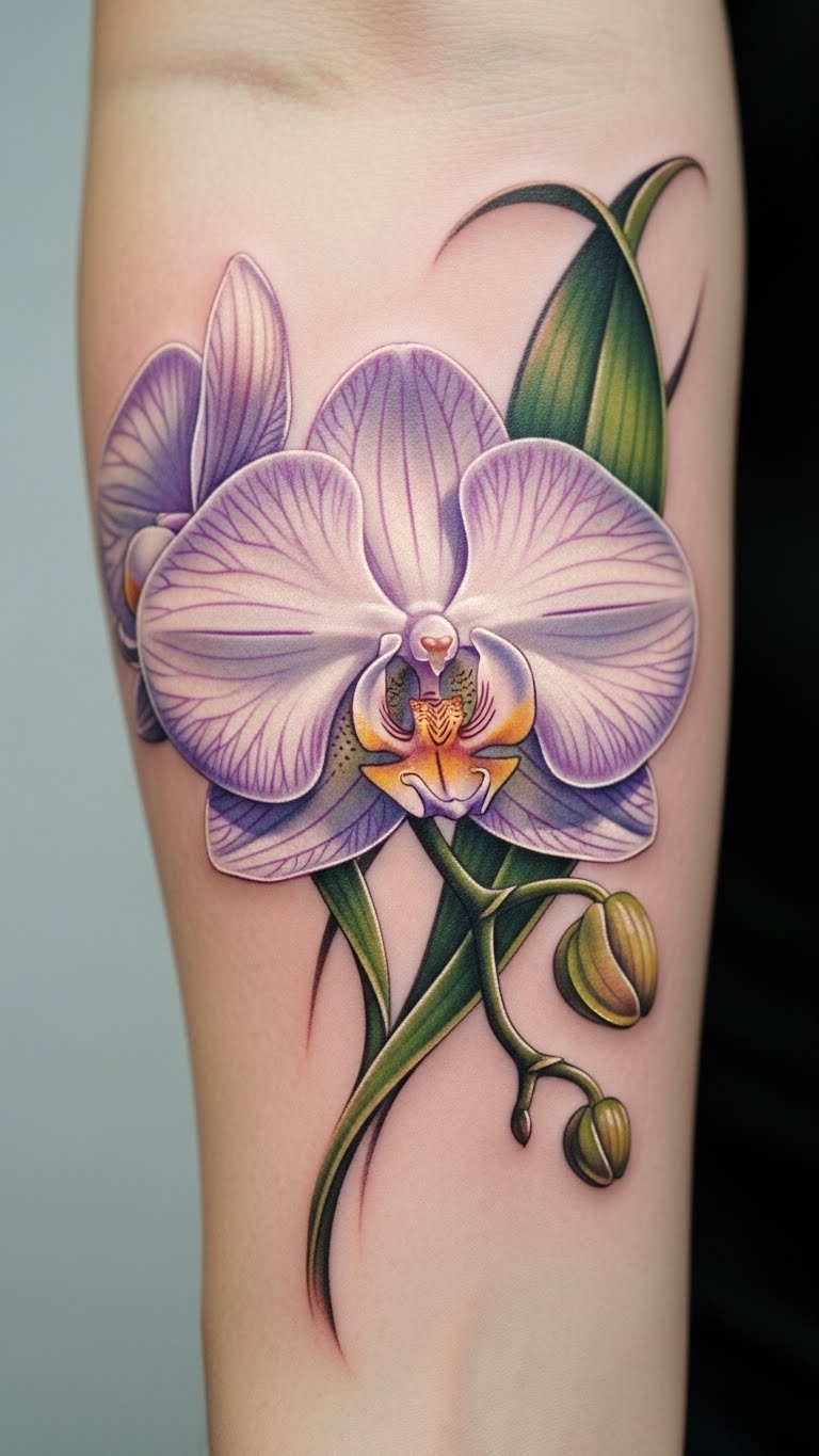 Realistic orchids make your forearm look alive. Lifelike petals draw you in. Study real orchids and draw them. Use photos to guide your home sketch. Choose artists good at realism without extras. Go with essential shades for cost control. Set it on the forearm curve for natural fit. This tattoo mimics nature. Practice with colored paper cutouts. Keep it to key features for efficiency. It brings real beauty to your skin.