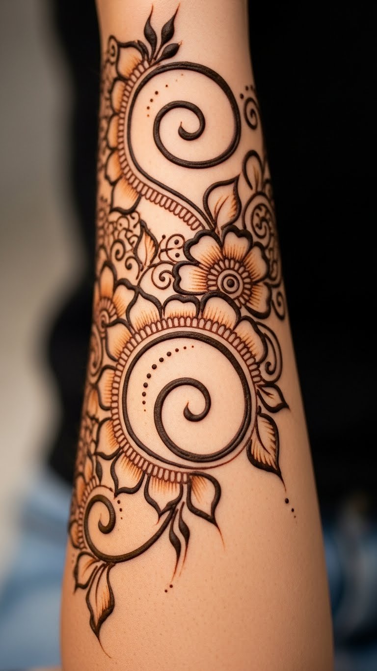 Henna-style florals give a temporary feel with permanence. Intricate loops flow gracefully. Make henna at home for practice designs. Online guides help copy the style. Look for artists who mimic henna cheaply. Use simple lines to save on ink. Place it wrapping the forearm for art. This design is adaptable. Test with actual henna paste. Aim for detailed but quick work. It adds a cultural flair to your arm.