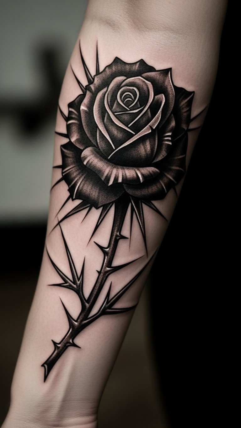 Gothic roses with thorns add an edgy twist. Dark elements make it bold. Draw dark roses from goth art. Use charcoal for your home version. Find artists who do dark themes affordably. Stick to black and gray for savings. Put it on the outer forearm for edge. This tattoo has presence. Experiment with shadow drawings. Keep thorns prominent for impact. It gives your arm a mysterious vibe.