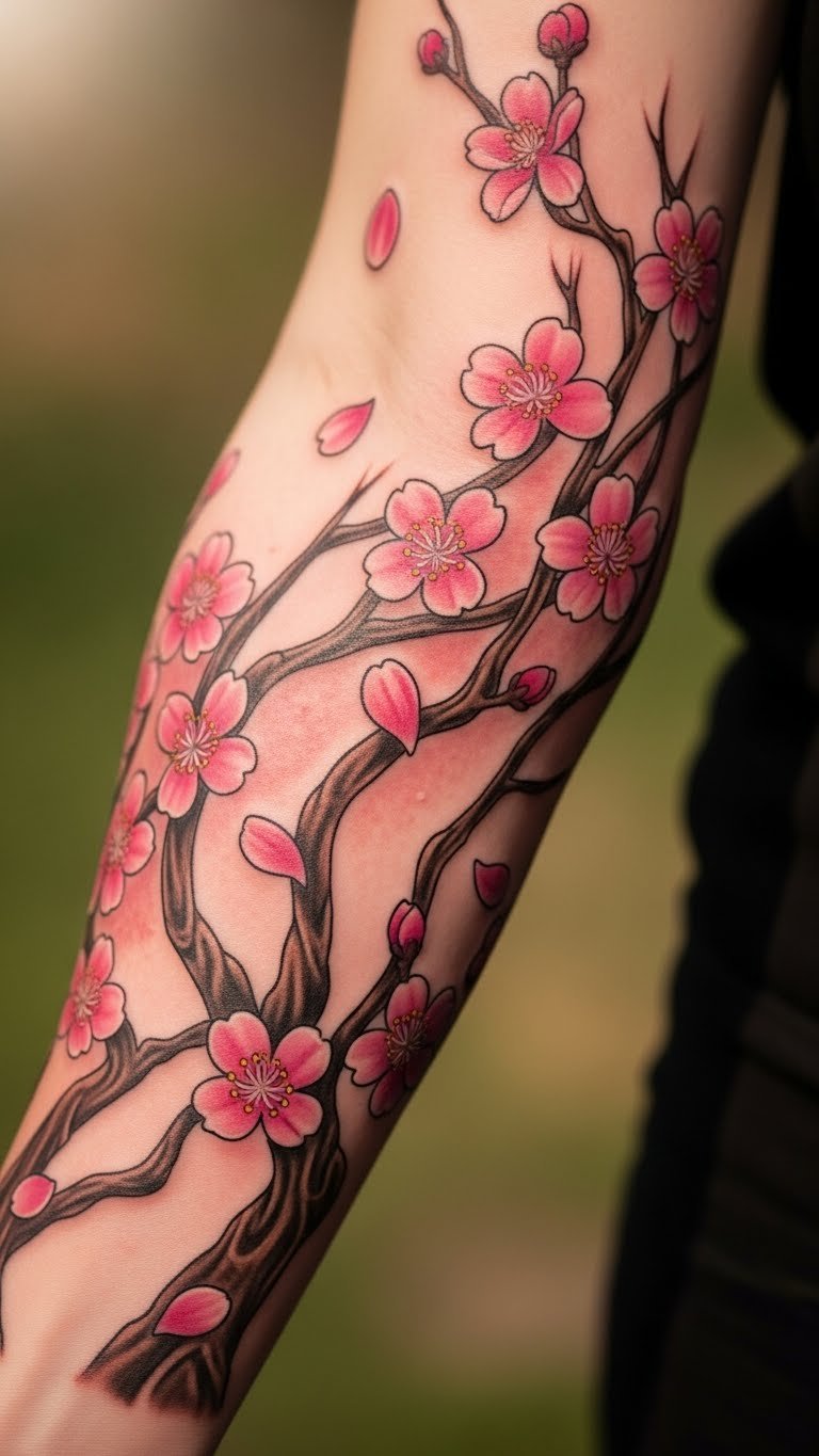 Japanese cherry blossoms honor tradition on your arm. Branch details add depth. Study Japanese art for ideas. Draw branches with ink at home. Find artists versed in the style without high costs. Go with outline and color for balance. Set it on the forearm length for tradition. This tattoo is meaningful. Practice with branch sketches. Aim for authentic but simple design. It connects your arm to history.