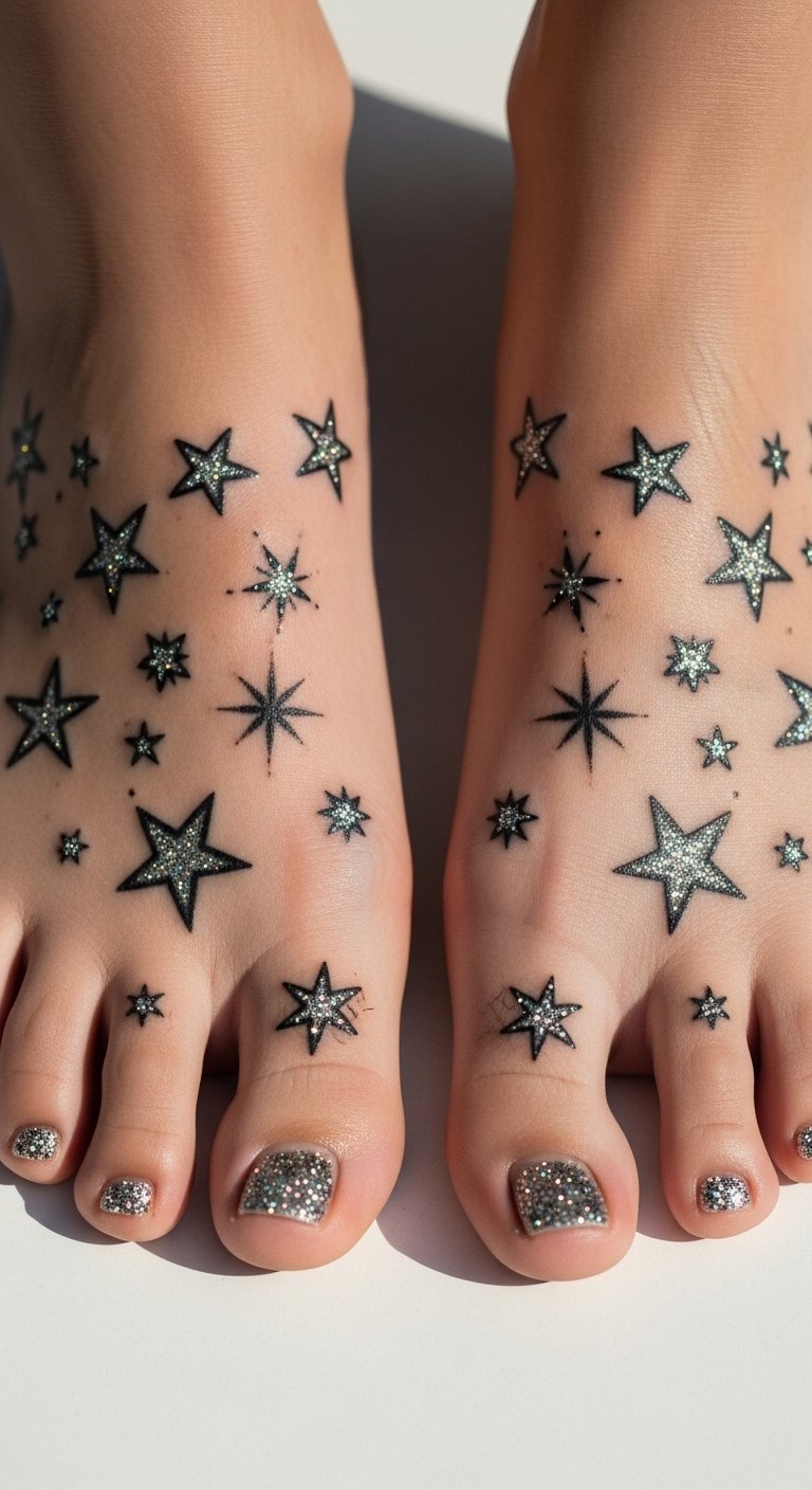 Stars on toes bring a night sky vibe. Go for tiny stars in a row. Stick on star decals from kids’ sections. Sketch with glitter pens for a trial. Find flash deals at studios. Wear them with summer outfits. Keep them simple for quick sessions. This adds magic to your walk without fuss.