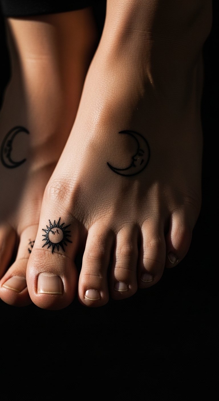 Sun and moon on toes balance day and night. Pick basic symbols. Moon and sun stickers work well. Trace from free designs. Find duo deals at shops. Show with open toes. Combine for a set. This is quick and meaningful.