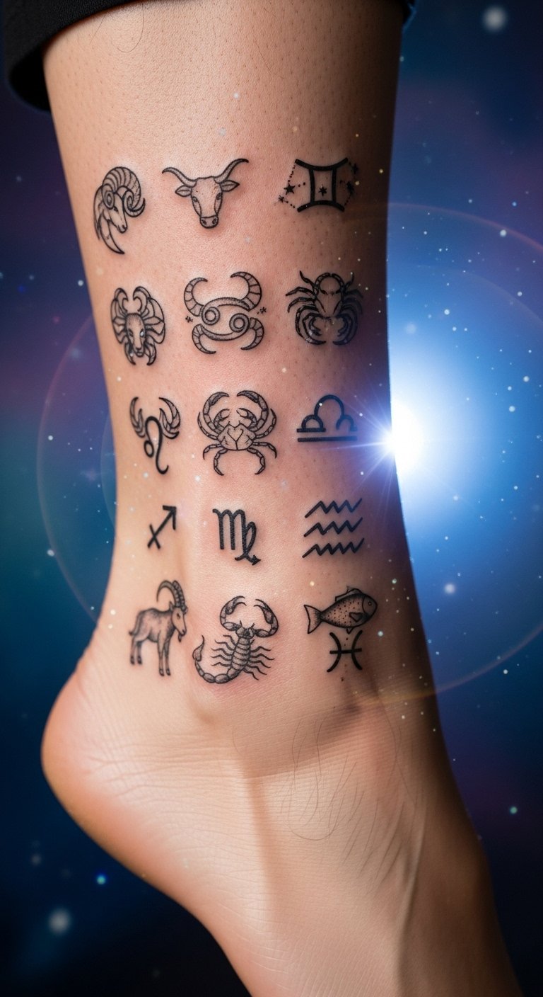 Zodiac signs on ankles add astrology. Choose your sign. Sign stickers easy. Draw from charts. Find star deals. Hide or show as needed. Keep it personal.