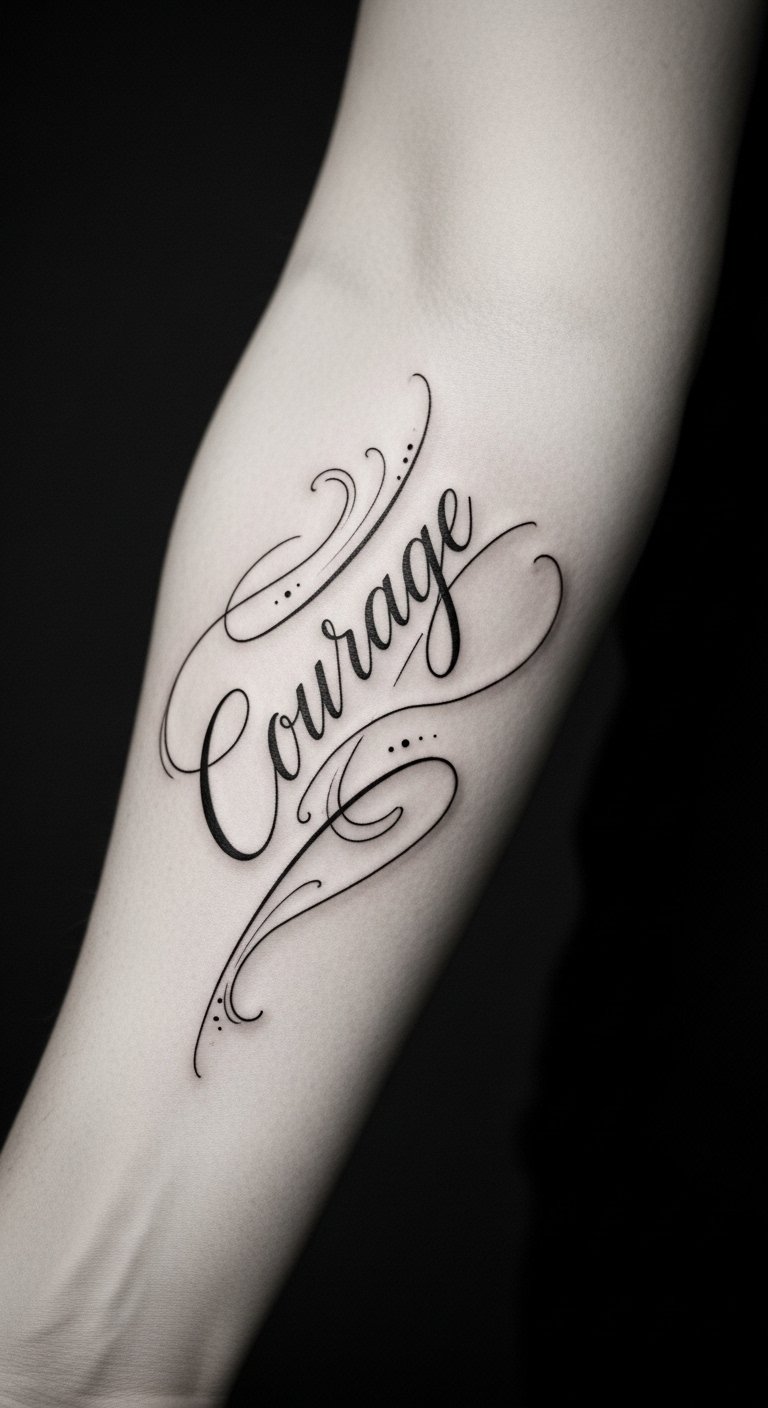 Go for “Courage Over Fear” to build confidence daily. Opt for a minimalist style to save money. Draw it freehand on your arm with a pen to see how it looks. Find an affordable parlor through community forums. Place it on the outer forearm for quick cover with sleeves. Combine it with a simple arrow drawing from online templates. Stick to basic colors to reduce costs. Schedule during off-peak hours for deals. Use phone apps to snap mock-ups at home. Make it a quick ink job in under an hour. Add personal touches like a star using household items. This design pushes you toward bold choices every day.