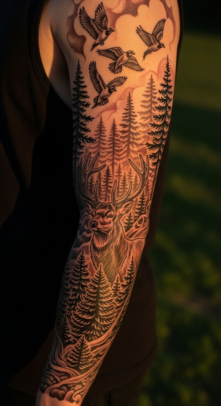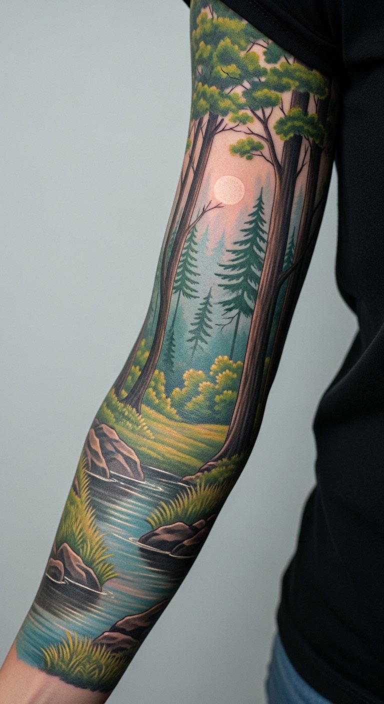 Full sleeve forest tattoos cover your arm completely. Think of endless trees and vines. Measure your arm at home for free. Get quotes from artists starting at $300. Use photo editors to extend designs. Add clouds for the sky. Full sleeves need multiple sessions for comfort. Heal step by step with home supplies. Plan with string outlines. These last with basic upkeep. They make a bold statement.