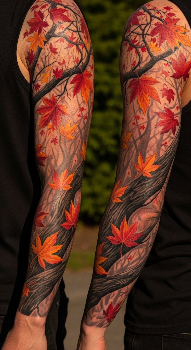 Autumn forest tattoos bring warm colors to your arm. Envision red leaves and twisting branches. Collect real leaves for free inspiration during walks. Get this design for under $200 at nearby studios. Use drawing apps to add your favorite shades. Include acorns for a personal nod. Autumn themes work on half-sleeves for cozy appeal. Use household oils for healing to save money. Test with seasonal stickers first. These tattoos fade less with yearly touch-ups. They capture the essence of fall in a simple way.