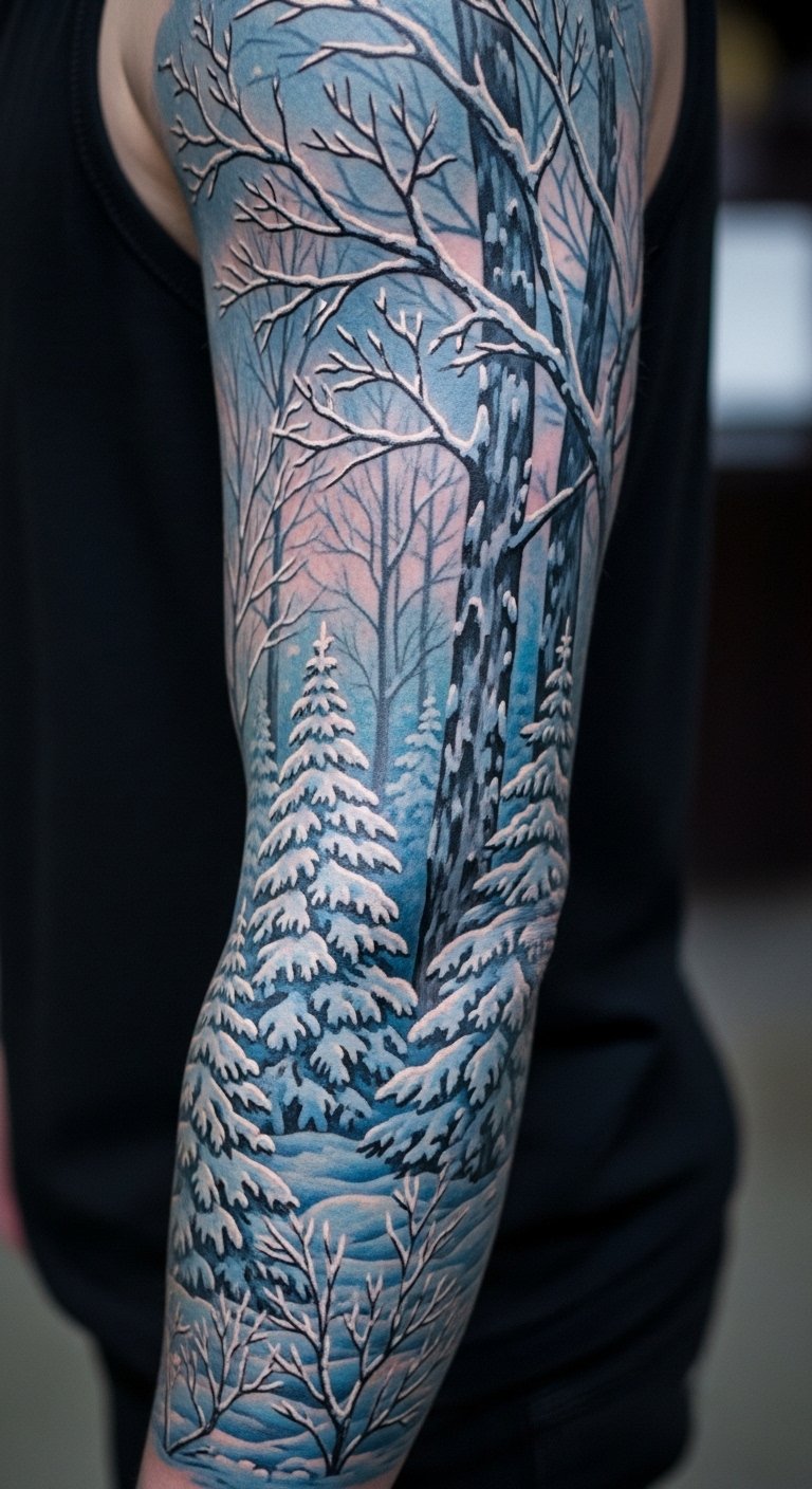 Winter forest tattoos create a cool, snowy scene. Picture frosted trees and quiet paths. Snap winter photos outside for free ideas. Studios offer these around $180. Experiment with blue shades using free software. Add a bird for extra flair. Winter designs suit full sleeves for dramatic effect. Heal with basic lotions from your cabinet. Try ice packs for any soreness. This style stays sharp with minimal effort. It brings a peaceful vibe to your skin.