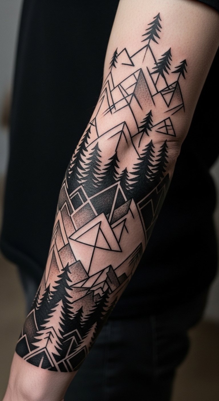 Geometric forest tattoos mix shapes with nature. See triangles as tree tops and circles as suns. Use graph paper to sketch patterns at home. Find artists for about $220. Free online templates help customize quickly. Blend in a star for uniqueness. Geometric styles fit half-sleeves neatly. Protect with affordable sleeves during recovery. Practice with string art as a fun preview. These tattoos require easy spot checks for fading. They offer a fresh take on forests.