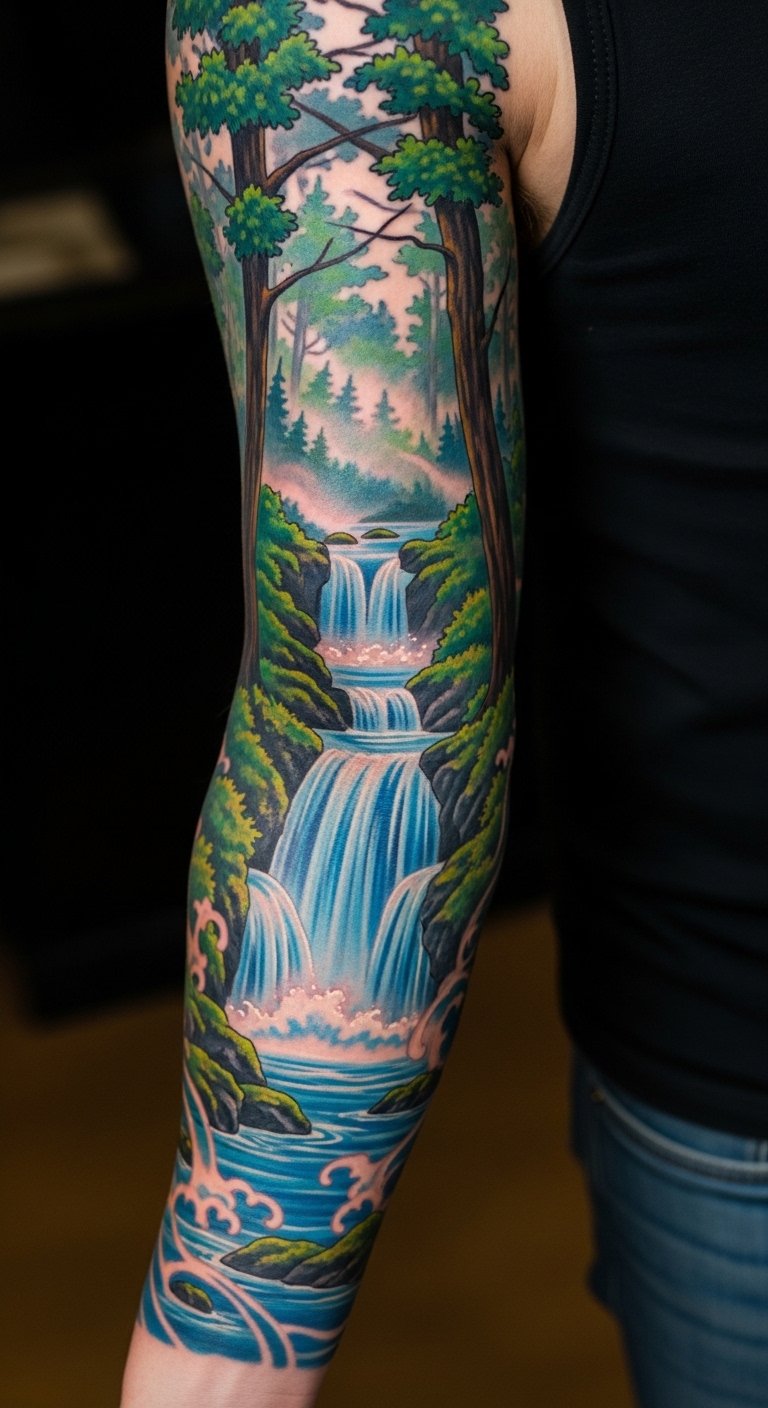 Waterfall forest tattoos show motion in your sleeve. Picture streams rushing past trunks. Visit parks for real inspiration at no cost. Get this for about $210 from artists. Simulate water with drawing tools online. Include fish for added detail. Waterfall themes flow on full sleeves. Use kitchen remedies for healing. Try water painting as practice. These designs keep their shape with simple maintenance. They bring calm to your arm.